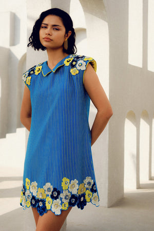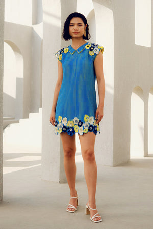 The Blue Caroline power dress is made of double georgette with padded shoulders. It features delicate floral and sequins detailing at the hemline and shoulders.