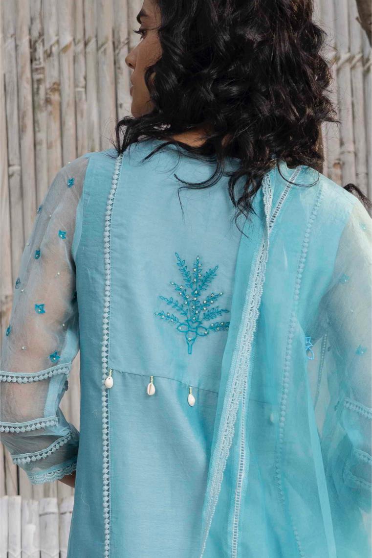 This elegant chanderi outfit set in our signature gathered kurta sillhouette is a peice of art. The tone on tone play of different elements - delicate organza on yoke and sleeves covered with beautifully crafted hand embroidered motifs, pretty laces, sprinkle of beads makes a unique peice for you to hold and chesrish.
