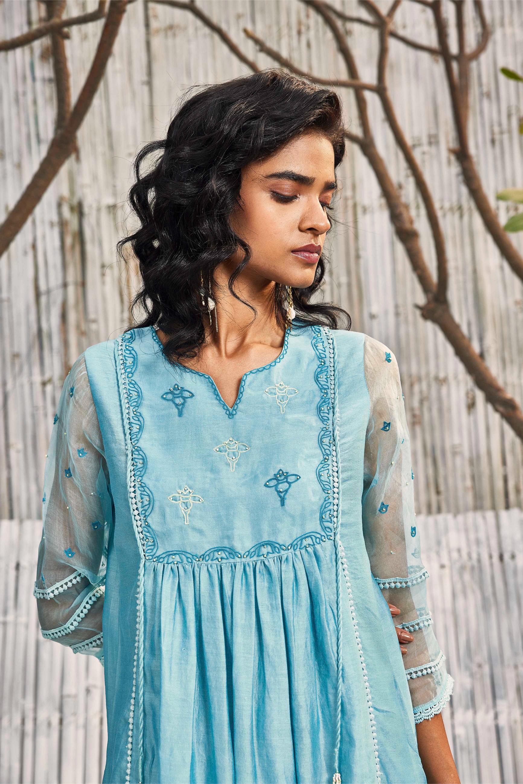 Blue Chanderi Gathered Kurta with Pant - Set of 2