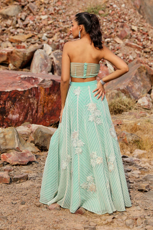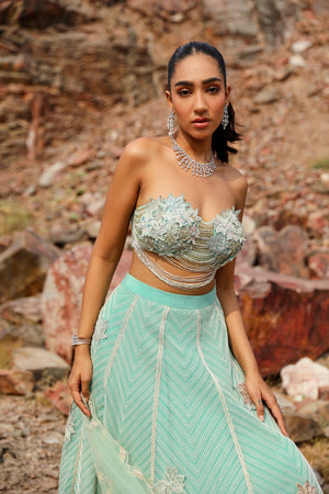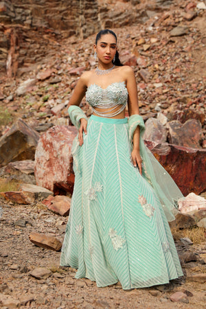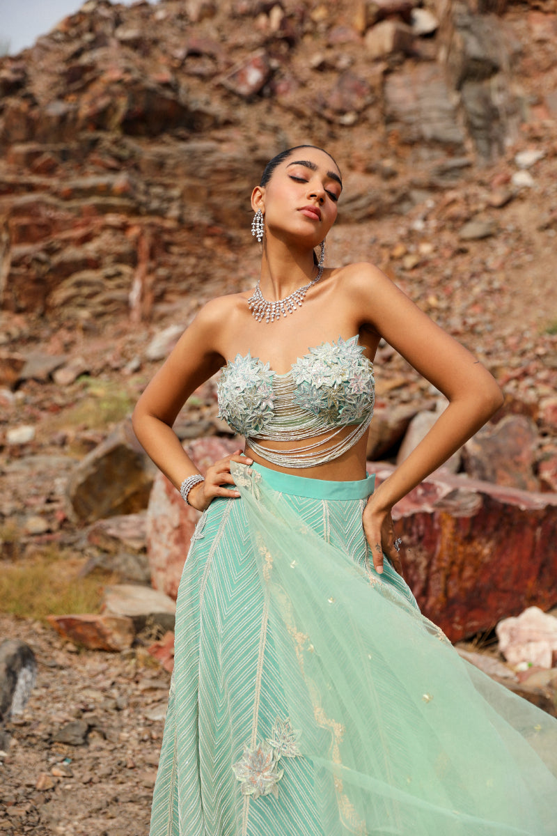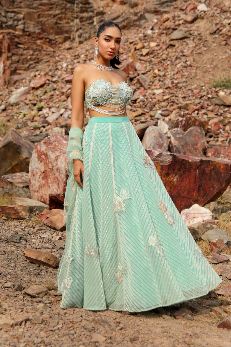 Blue Chevron Lehenga Which Is Full Hand Embroidered With Dori And Crystle Work , Corset Blouse With 3D Work And Crystle Hangings, Paired With Dupatta