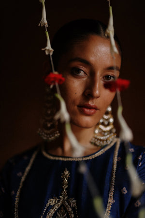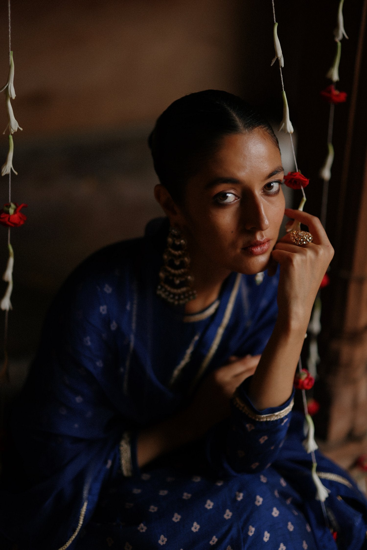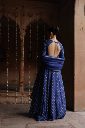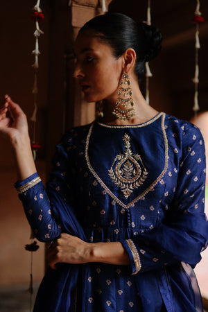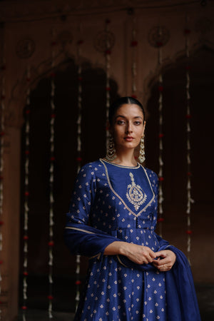 Blue Dupion Silk Embroidered and Printed Anarkali Set