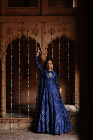 Featuring a blue printed anarkali embellished with zardosi embroidery on yoke and sleeves. It comes with pure organza dupatta.