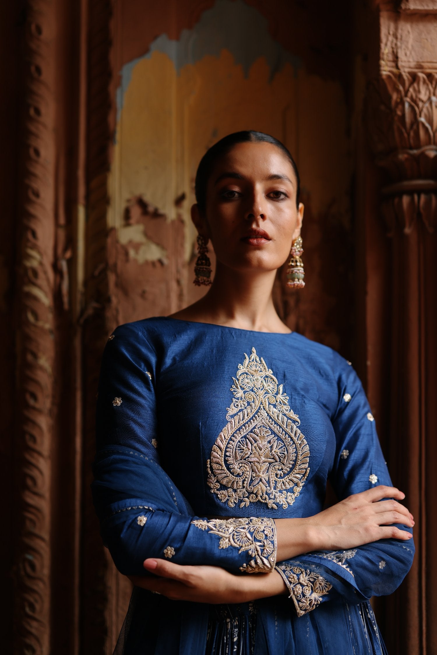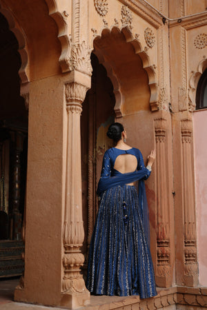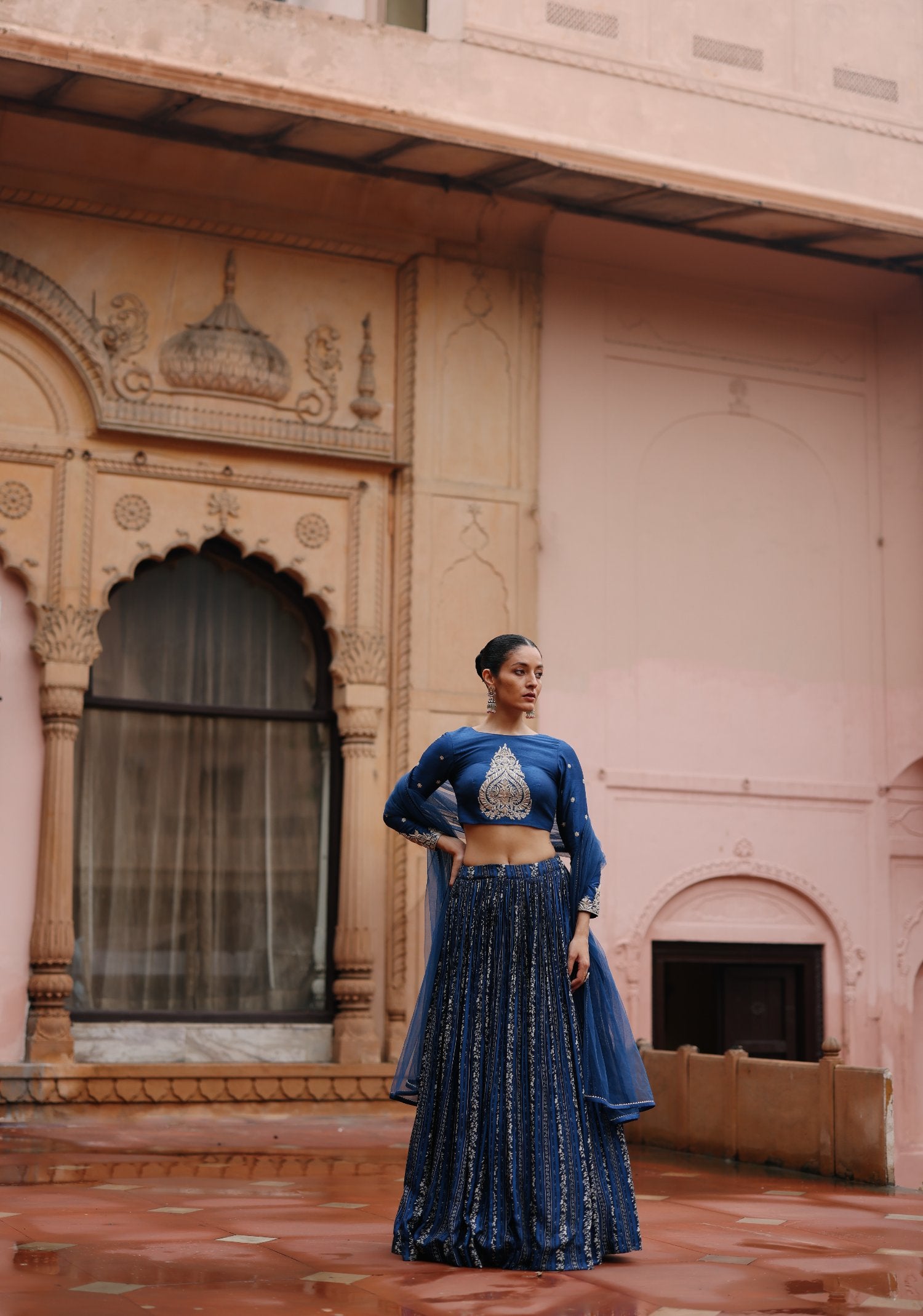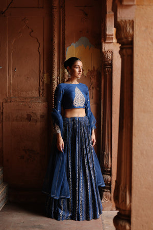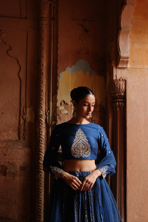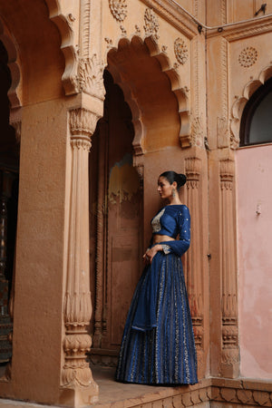 Featuring a blue silk printed lehenga paired with solid blue silk blouse embellishlud with dori, sequin and zardosi embroidered. It comes with a net dupatta.