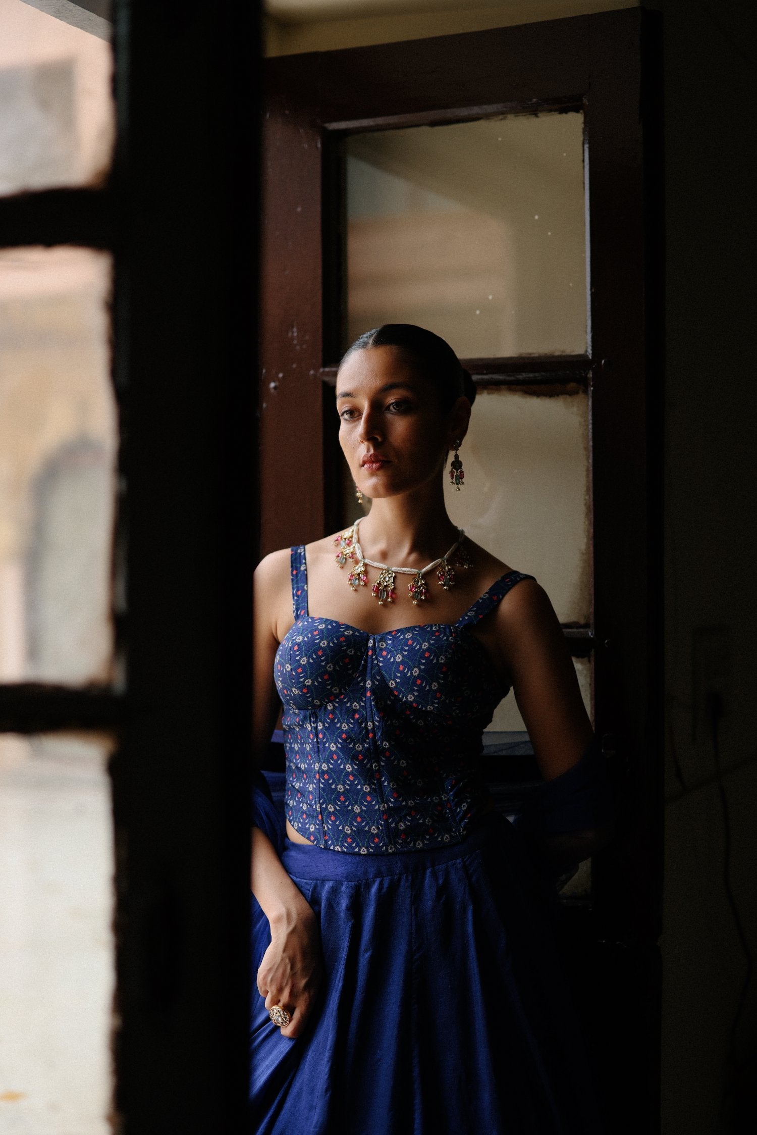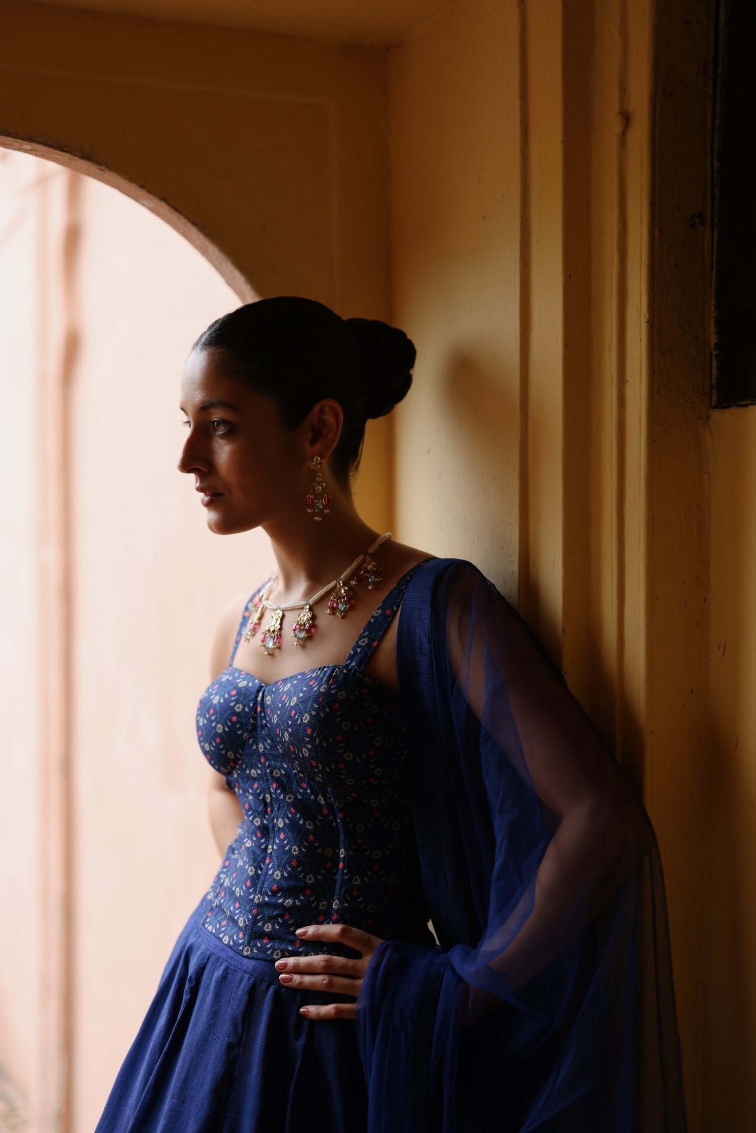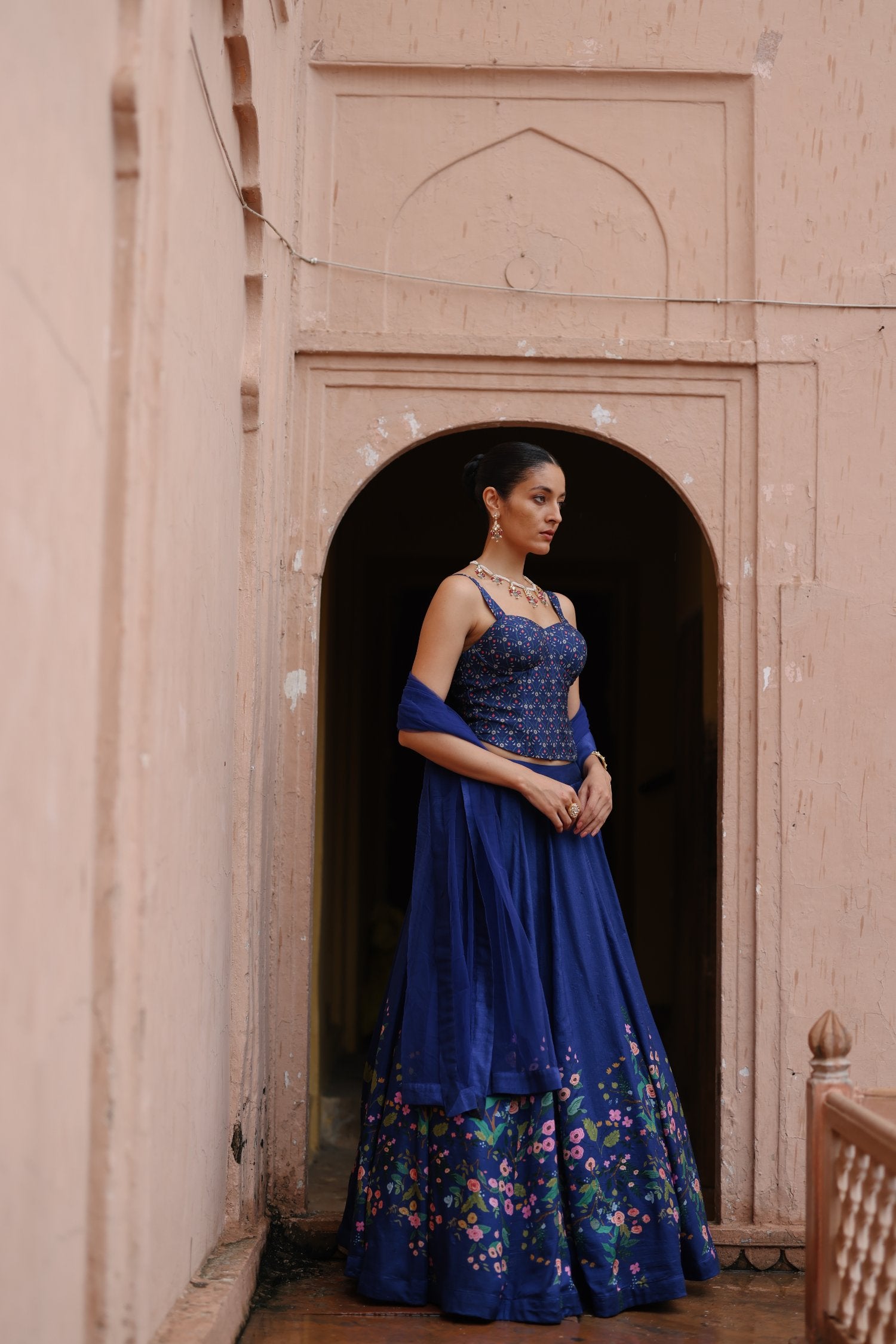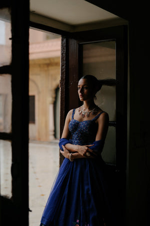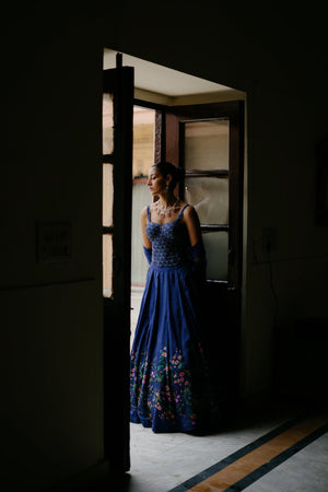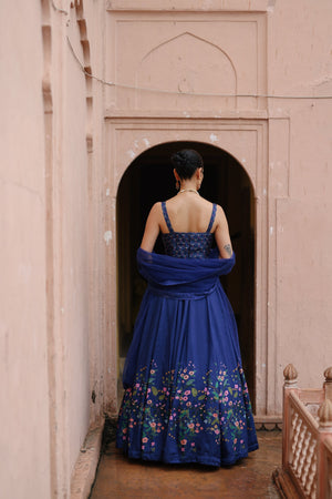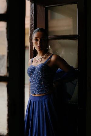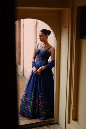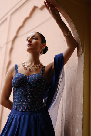 Featuring a blue silk floral printed lehenga paired with blue printed corset and net dupatta