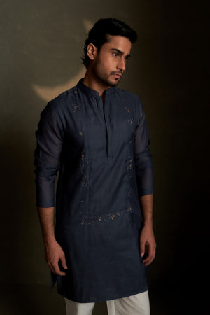 This men’s kurta pyjama set blends timeless style with celestial accents. The long-sleeved kurta features an extended front yoke adorned with delicate star motif embroidery, accented by a few glass crescent moons placed along the yoke edge for a refined celestial touch. Paired with straight pyjamas, it’s an understated yet elegant choice for festive occasions.