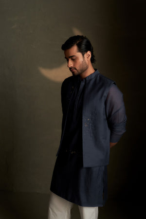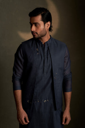 This men’s kurta pyjama set blends timeless style with celestial accents. The long-sleeved kurta features an extended front yoke adorned with delicate star motif embroidery, accented by a few glass crescent moons along the yoke edge. It is layered with a short open jacket, embroidered at the front with star motifs and glass crescent moons arranged in an artful scatter. Paired with straight pyjamas, it offers an understated yet distinguished festive look.