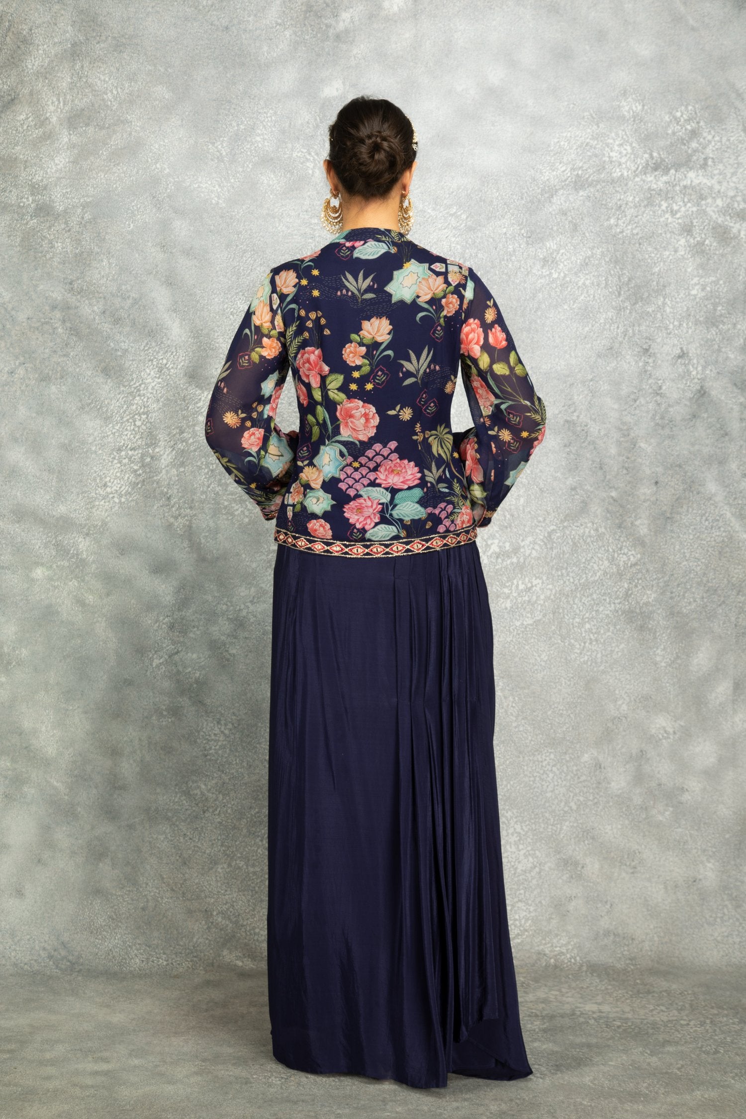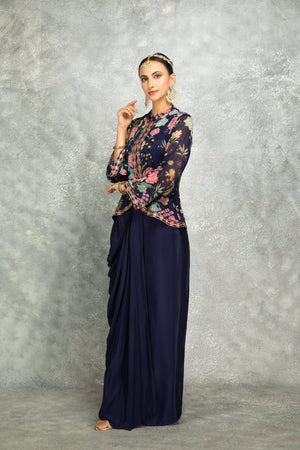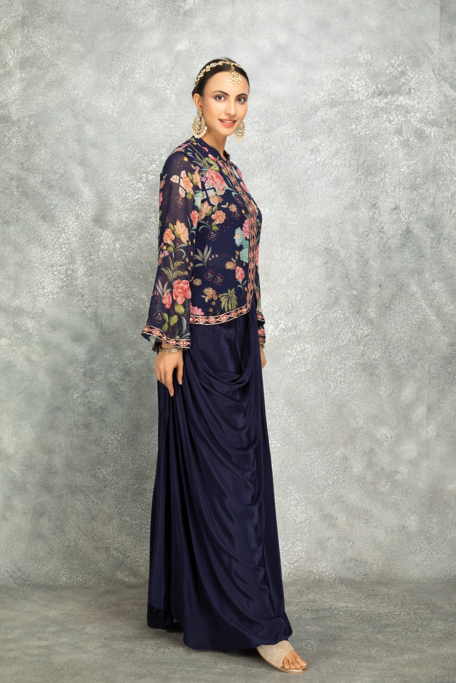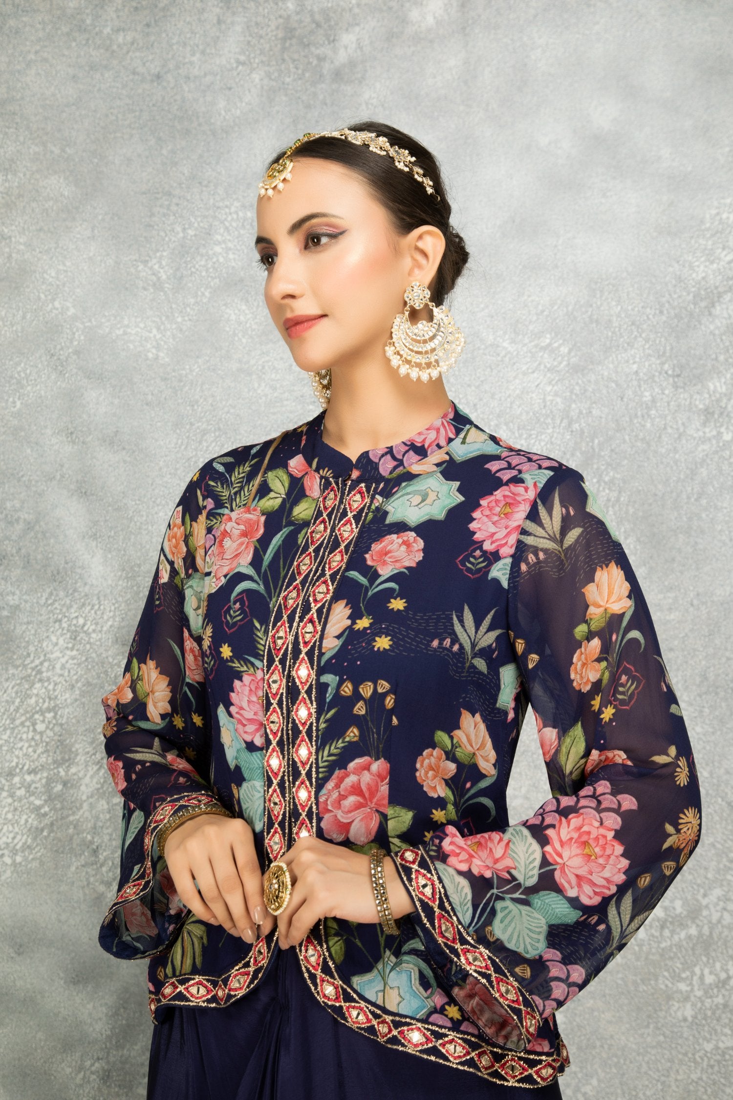 Featuring a vibrant hot pink floral printed jacket with intricate mirror work detailing on soft georgette fabric, paired with a solid drape skirt in luxurious modal silk, offering a sleek and contemporary silhouette. Perfect for a sangeet or engagement ceremony, this outfit is best complemented with statement jewelry and heels for a standout, celebratory look.