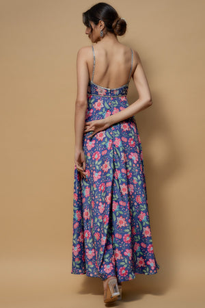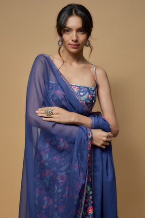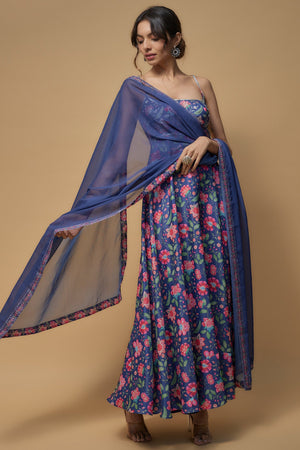 Blue French Crepe Printed & Embroidered Anarkali Set