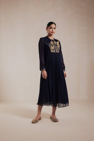 An elegant blue georgette dress adorned with intricate gold embroidery on the yoke,