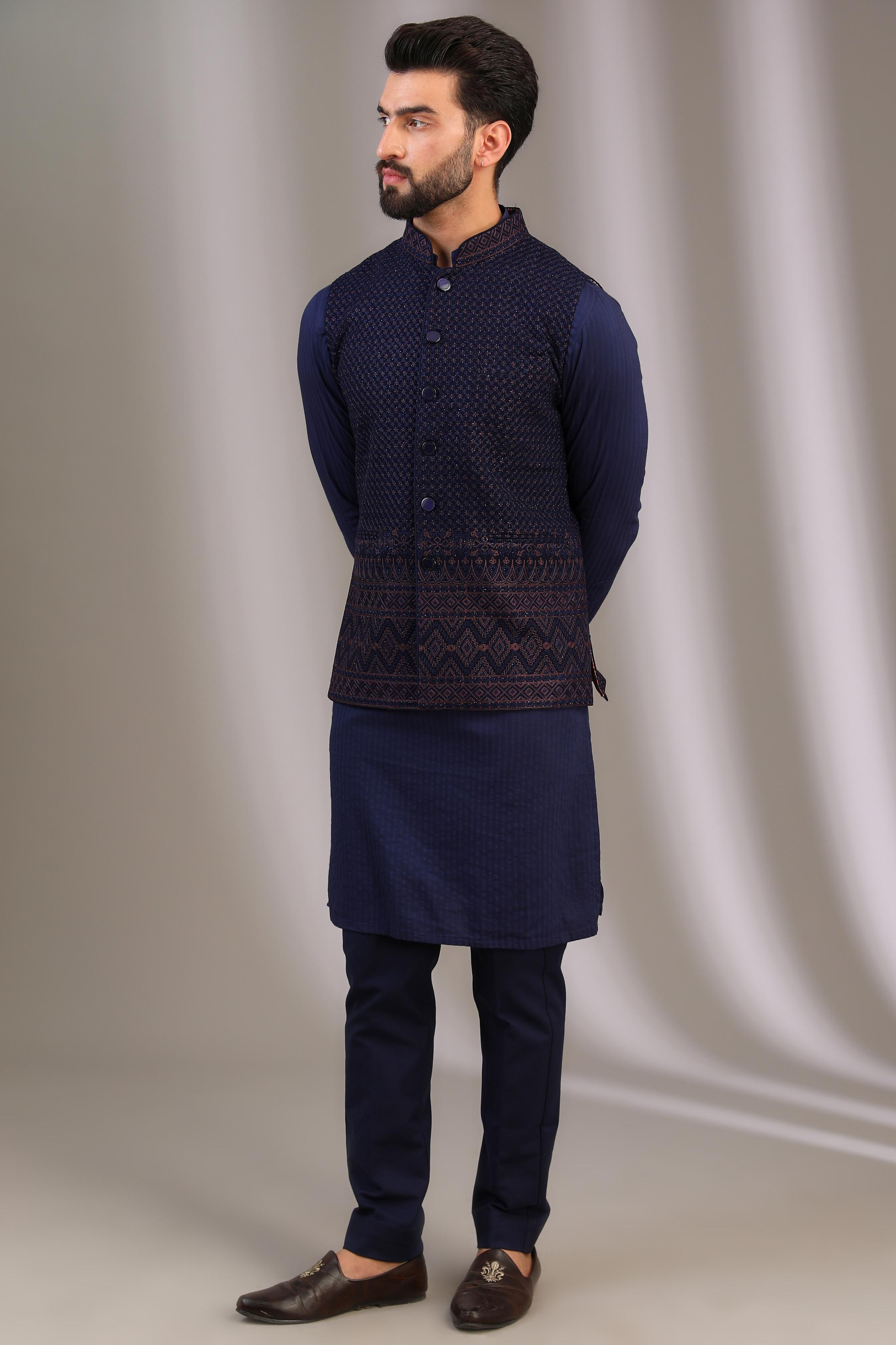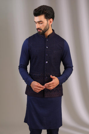 BLUE GORGTTTE HEAVY BORDER AT BOOTAM FULL THREAD + SEQUIN JAAL BUNDIW COTTON SILK KURTA + PANT