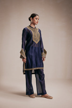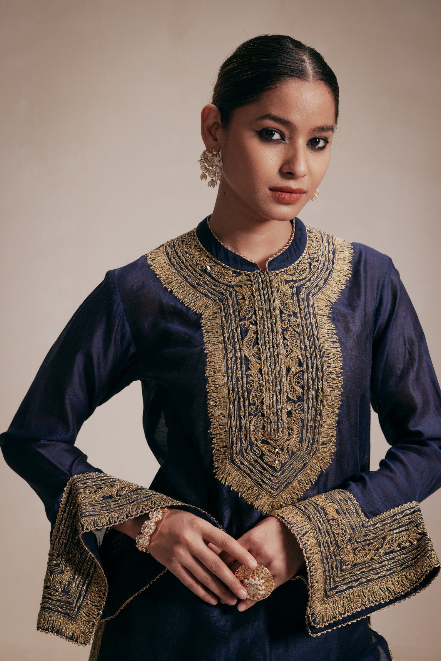 Blue sleeves crafted chanderi kurta in gold embroidery on yoke with trouser & dupatta