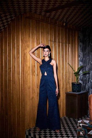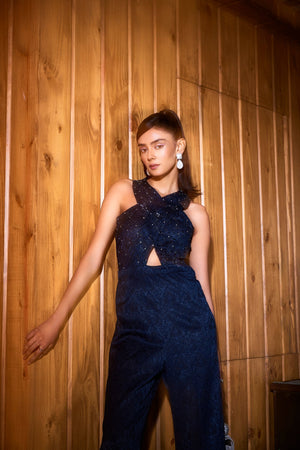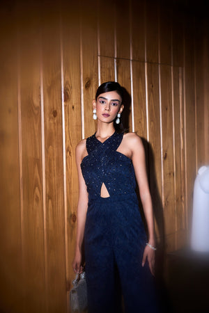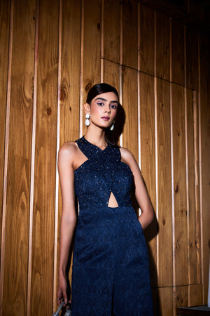 Navy Blue Jacquard Cross Shoulder Jumpsuit. It Has Tonal Cut Daana And Zircon Embroidery.