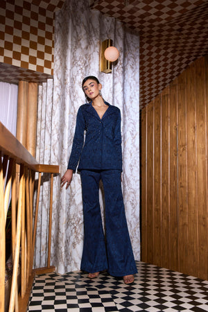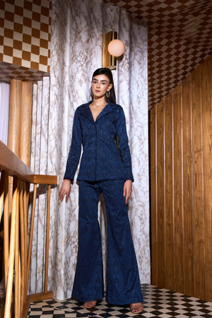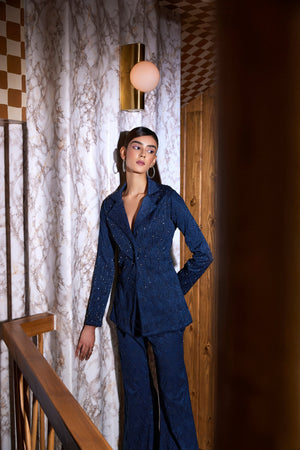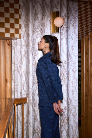 Navy Blue Jacquard Pantsuit. It Has Tonal Cut Daana And Zircon Embroidery Falling Down From The Neck And Upwards From The Sleeve.