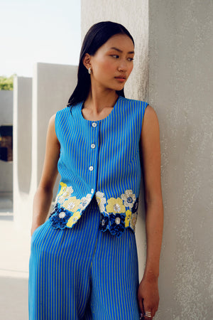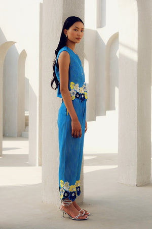 The Blue Margot waistcoat co-ord set is made of double georgette. It features delicate floral embroidery and sequins detailing at the hemline of the shirt and trousers.