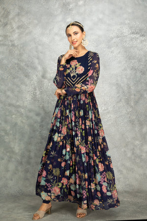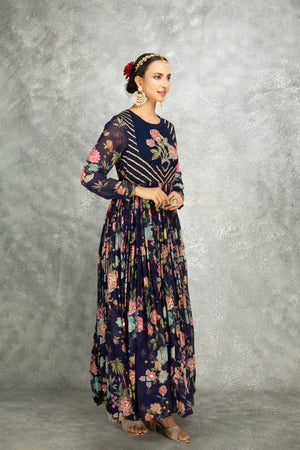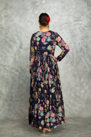 Blue Mirror Work Anarkali With Scalloping Dupatta