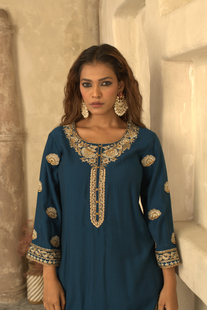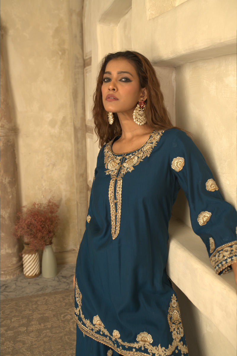 BLUE MUGHAL JAAL BEL SHARARA SET