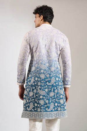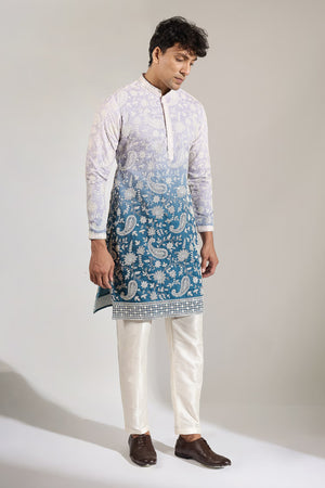 Blue crepe silk based ombre kurta enhanced with floral thread and sequins embroidery, paired with an off white dupion silk based pants.