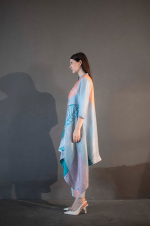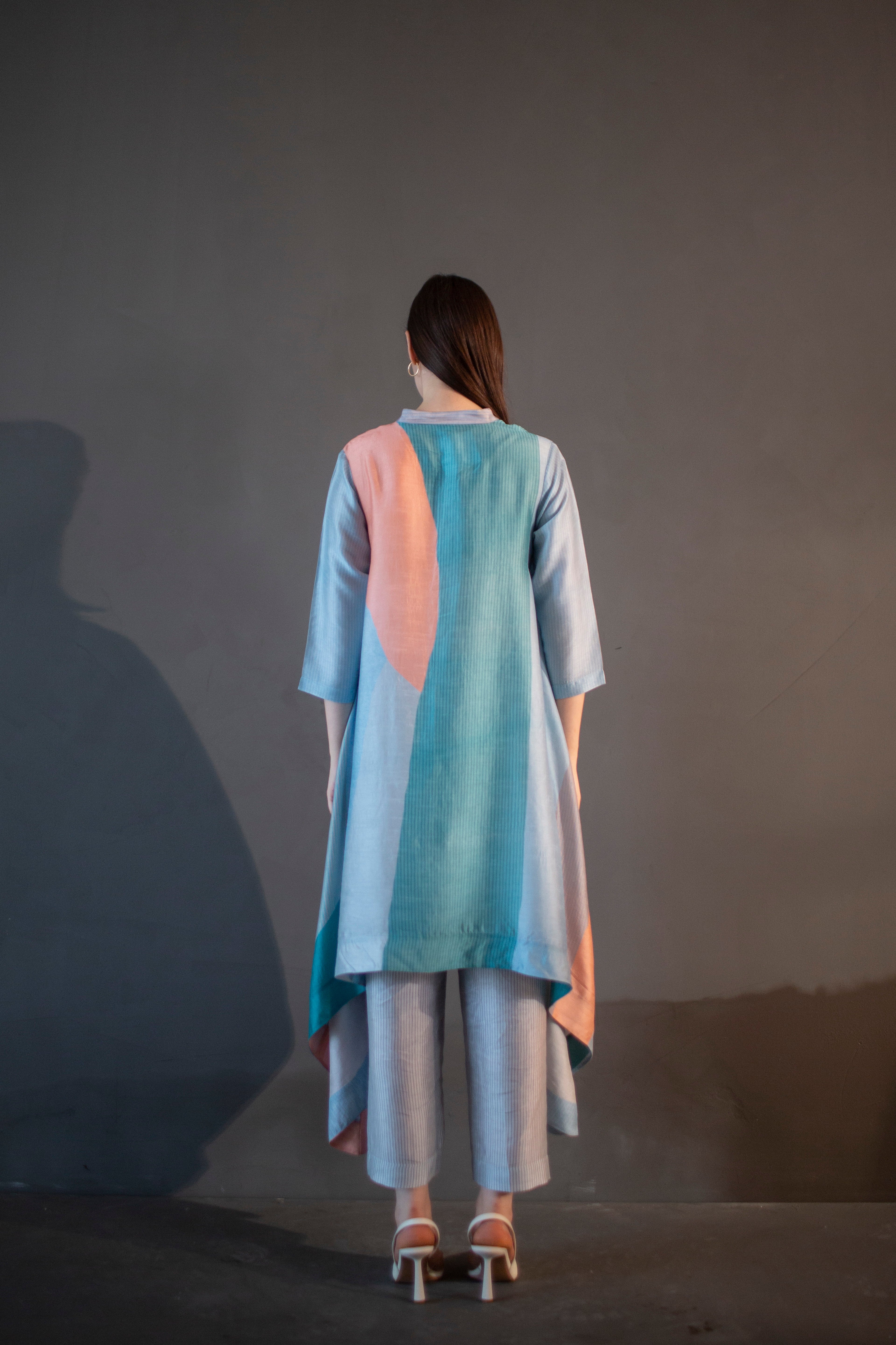 A two piece dupion silk set comprised of abstract geometric and floral print in playful color compositions and parallel pants with fusion textiles.