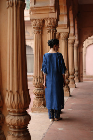 Featuring a solid blue silk kurta with dori, sequin and zardosi embroidery on sleeve and neckline. It is paired with printed silk pants.