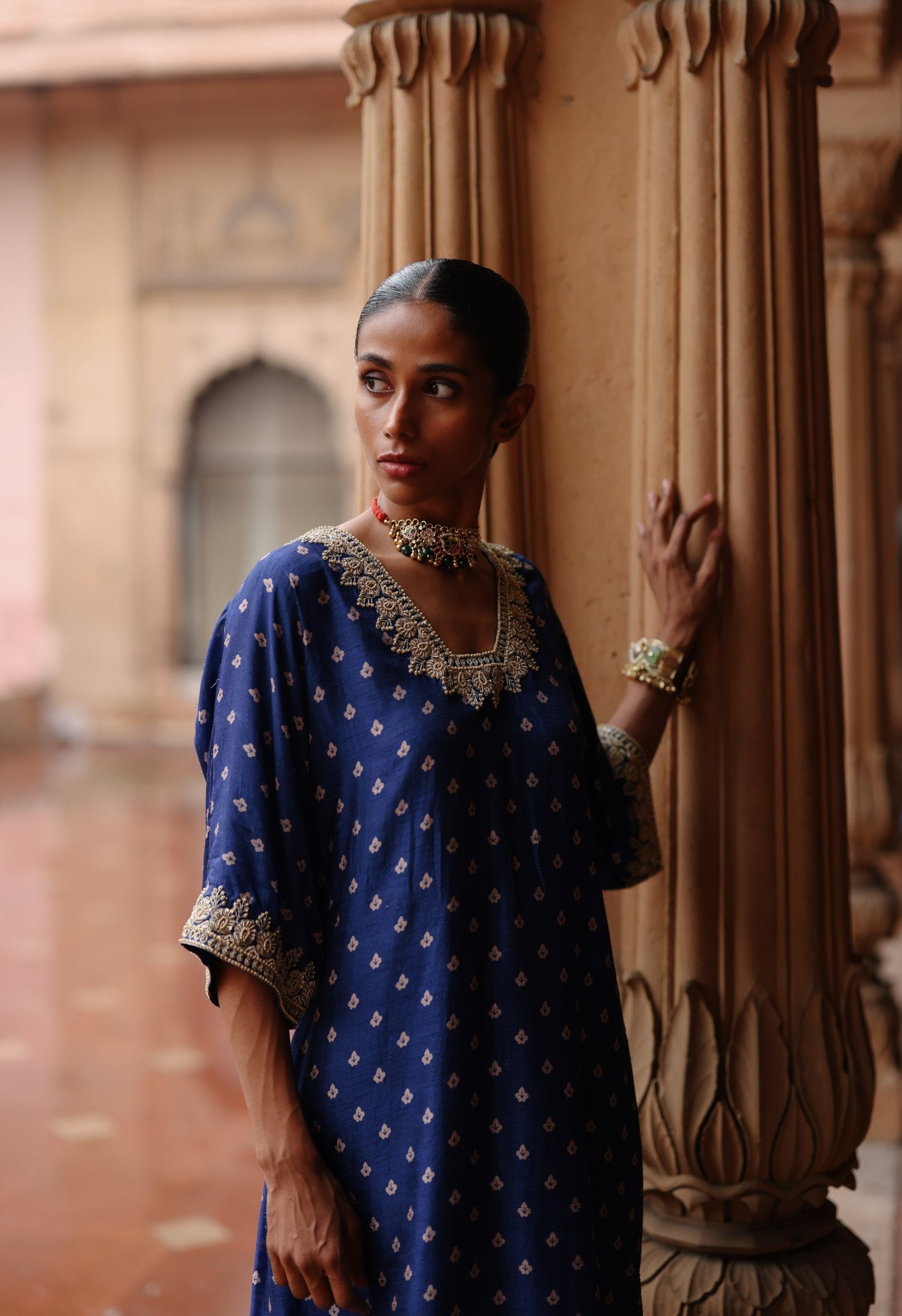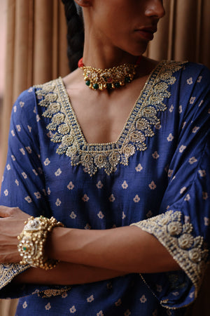 Blue Printed and Hand Embroidered Dupion Silk Kurta Set