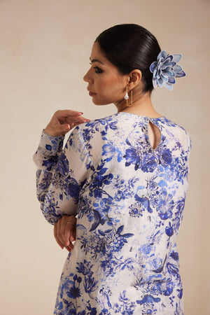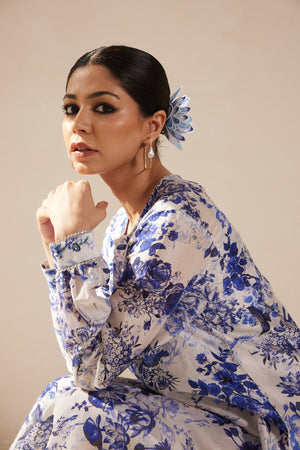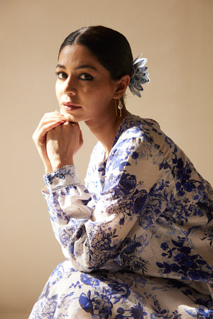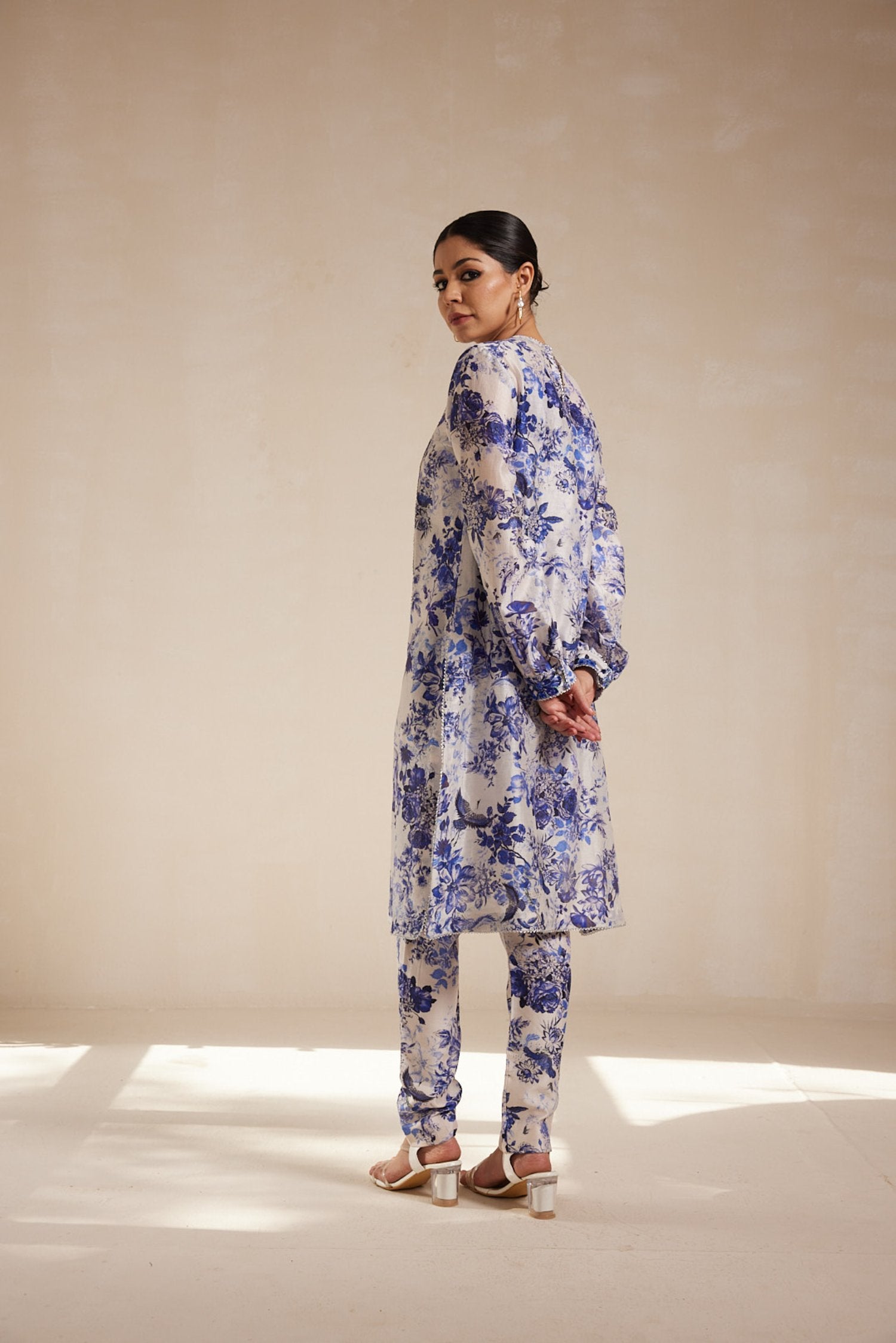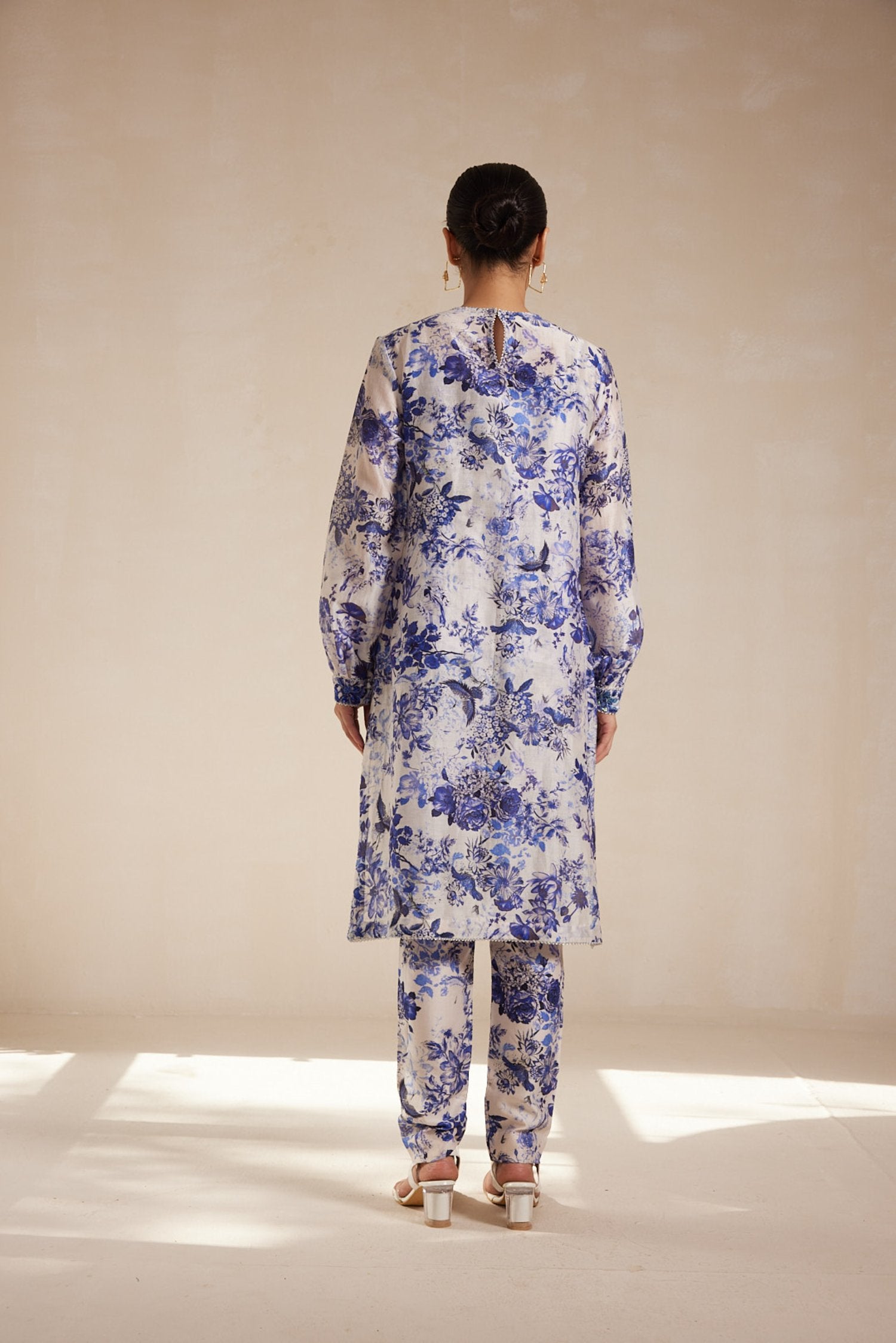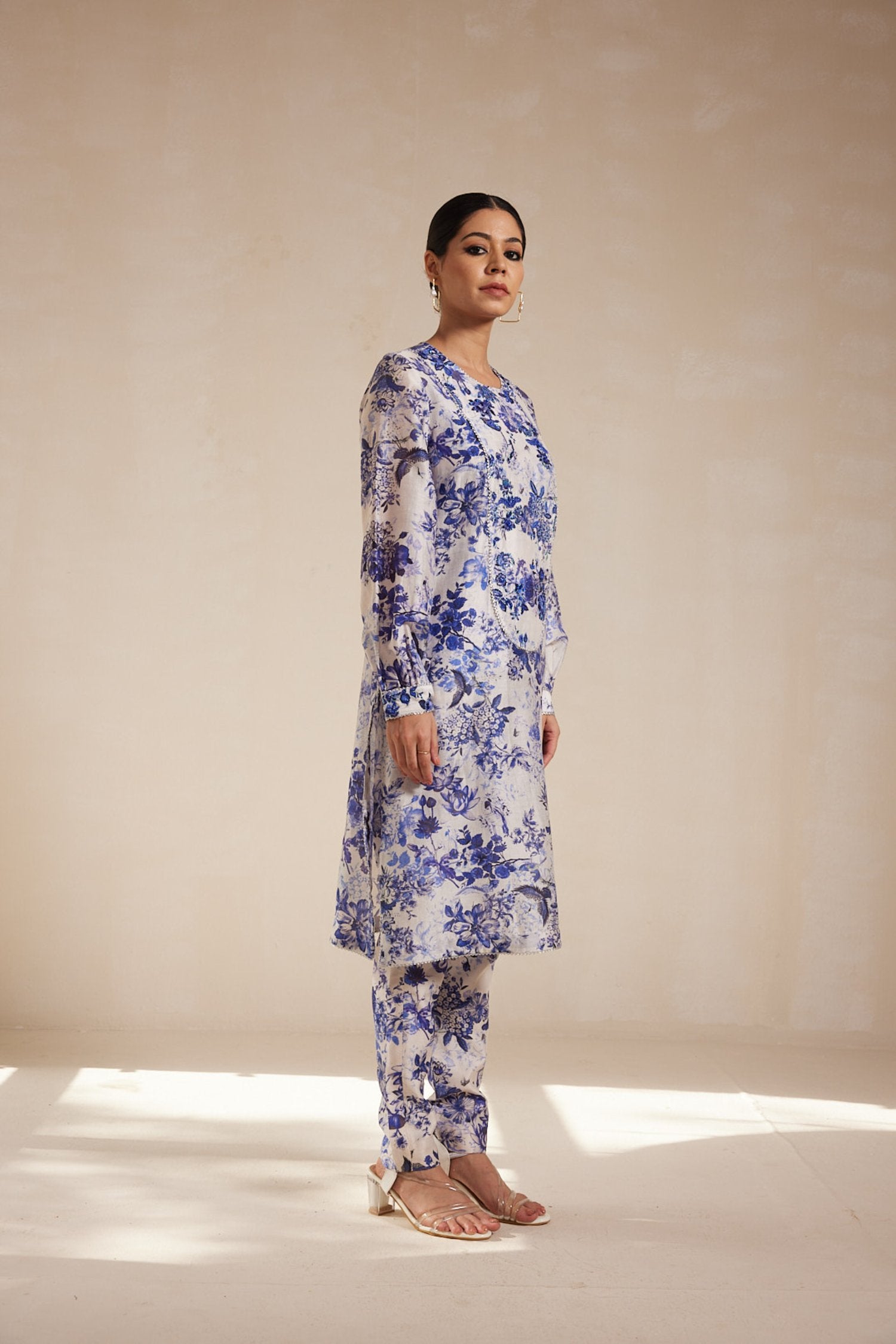 Printed chanderi silk kurta with lace finishing on yoke paired with straight pants