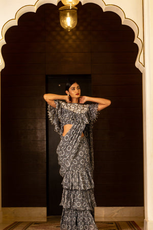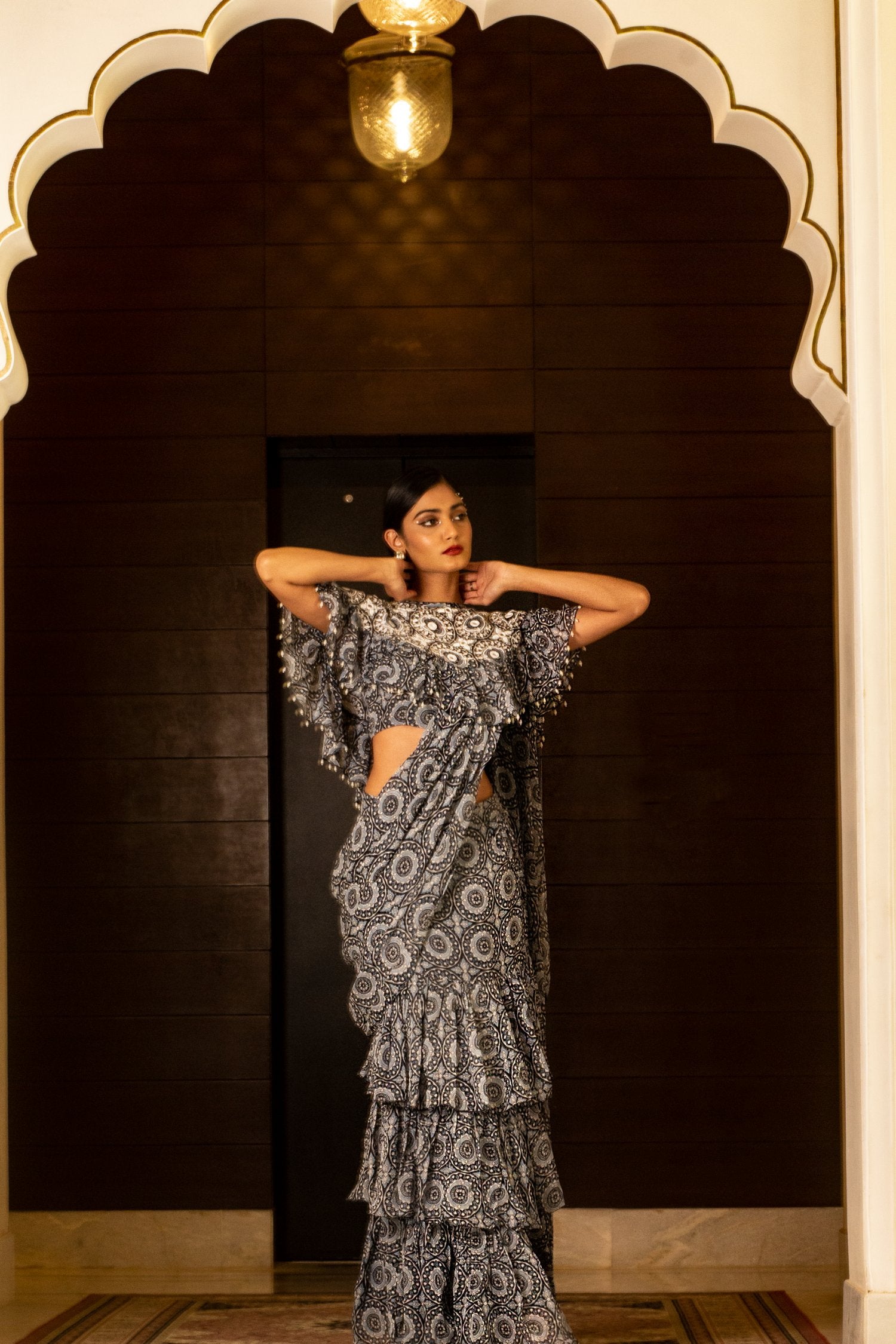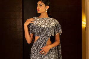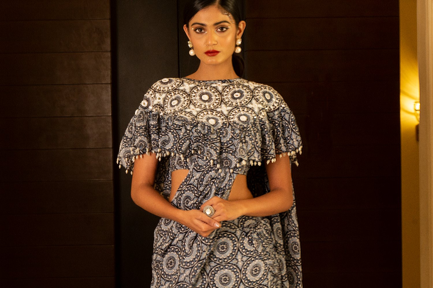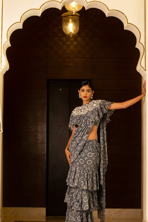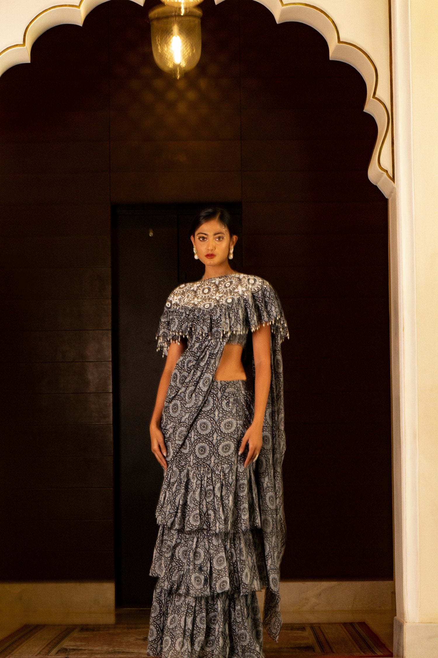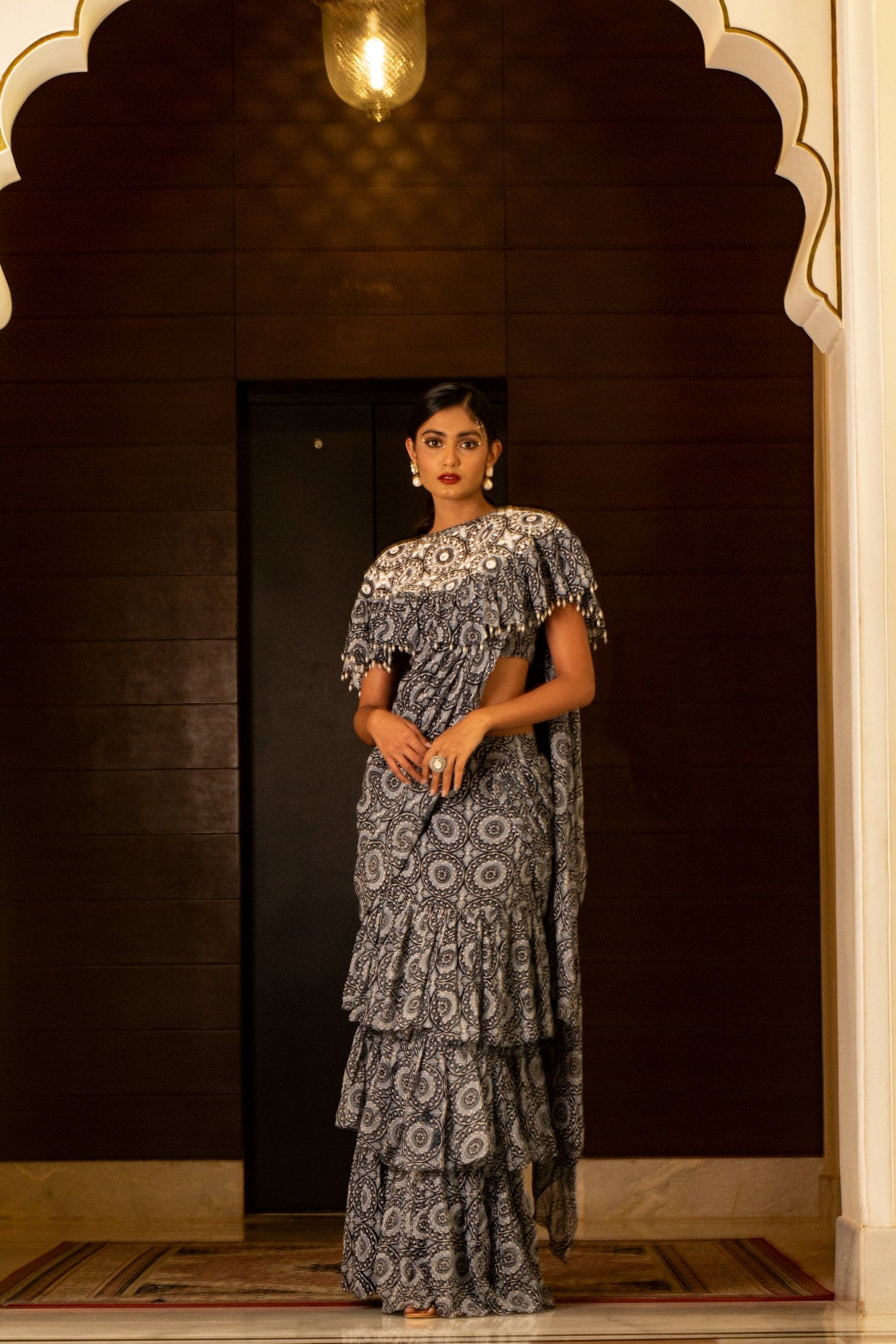 Blue printed skirt saree, comes with a blouse and cape. The cape is embellished with mirror, moti and dabka work all over.