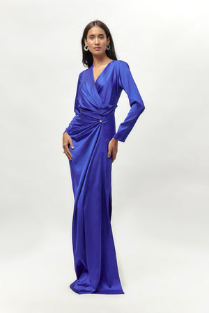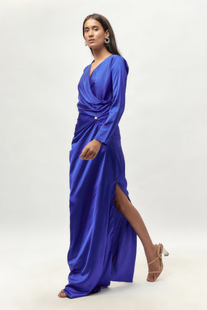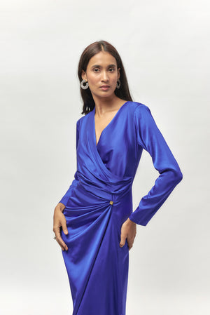 The Blue Satin Drape Full Sleeve Dress exudes refined elegance and effortless sophistication. The full sleeves add a graceful, structured element, while the draped design creates a flattering, fluid silhouette that moves with every step. Perfect for an evening affair or a formal occasion, this dress combines timeless style with modern charm.