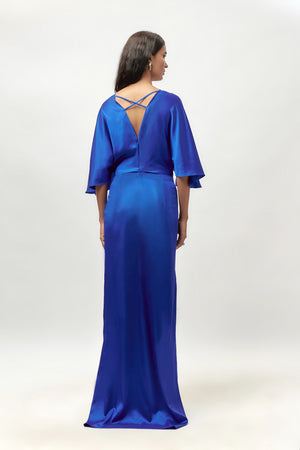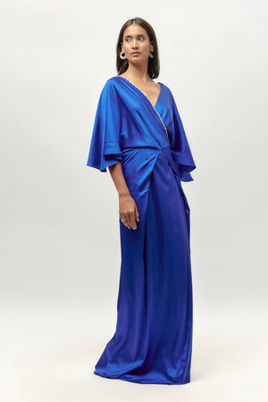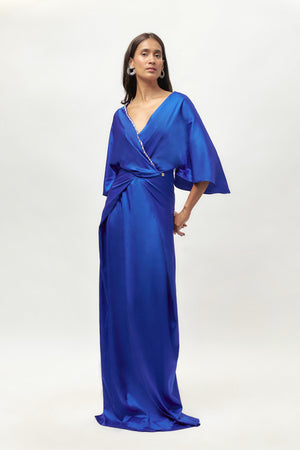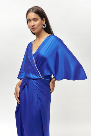 Blue Satin Embellished Drape Kimino Sleeve Dress