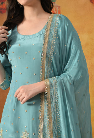 This refined aqua blue sharara set is elegantly hand crafted and hand embroidered, featuring intricate zardozi work enhanced with delicate applique detailing, pearl accents, and subtle sequin highlights. The fluid crepe kurta paired with a luxurious Benarsi chinon sharara and lightweight chinon dupatta creates a graceful festive silhouette—ideal for haldi, mehndi, and celebratory occasions.