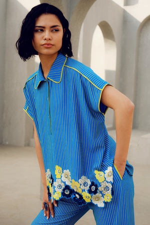 The Blue Sylvie shirt has short sleeves and a regular collar. It comes in a striped pattern with delicate floral detailing and sequins at the hemline.
