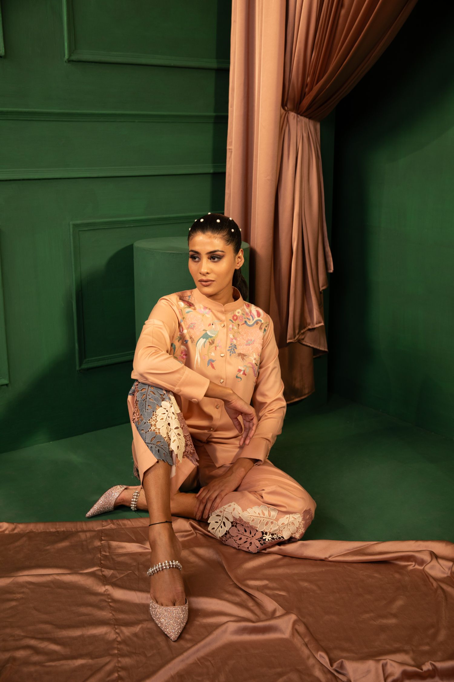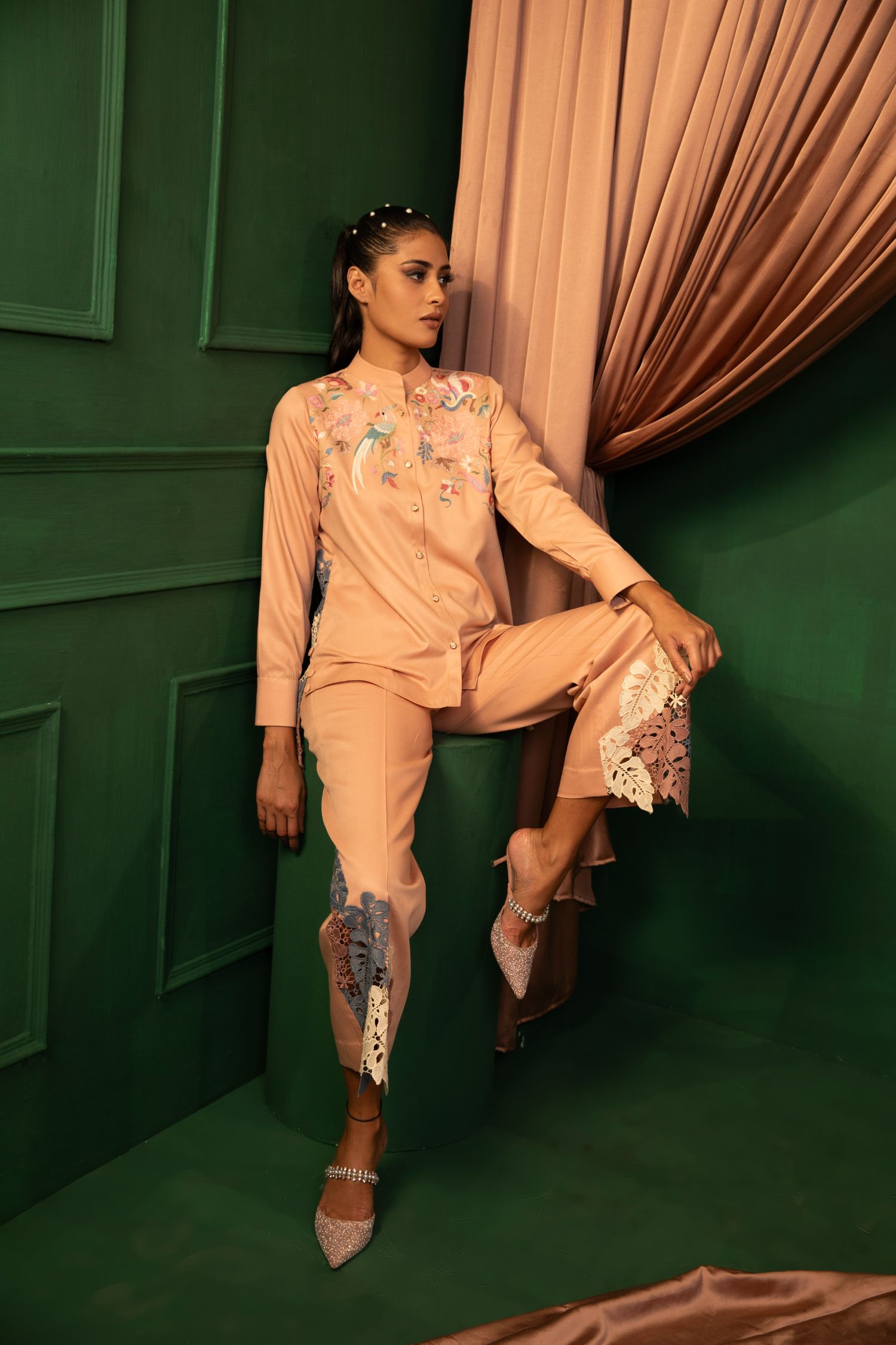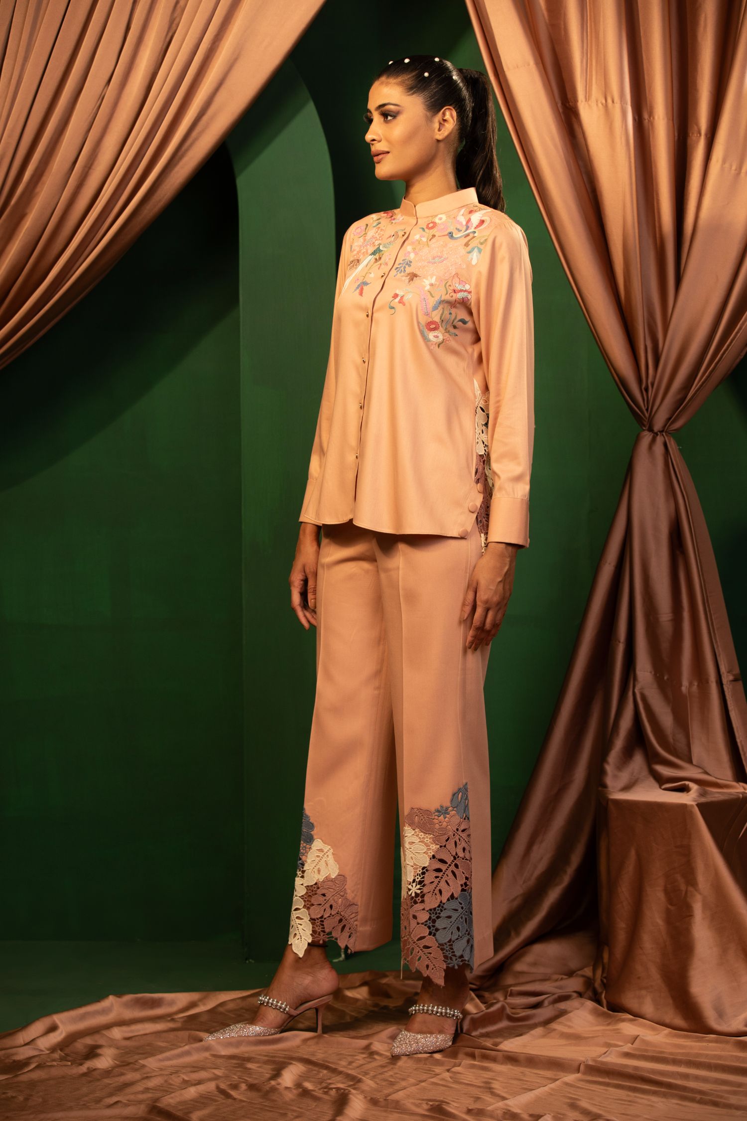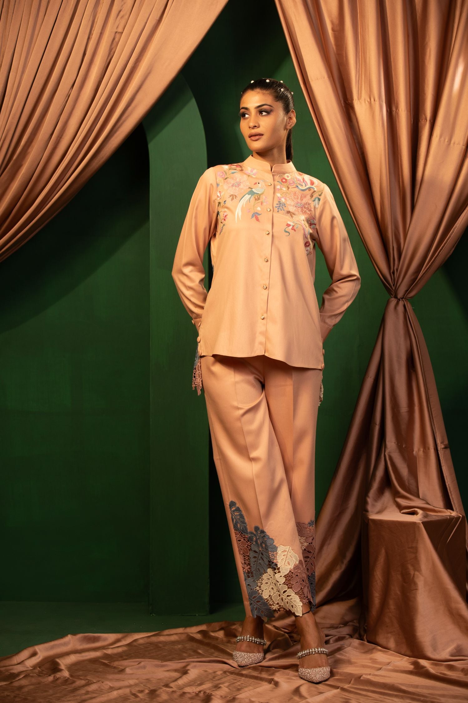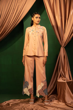 The Blush Beauty ensemble is a soft, pastel dream. Its intricate hand and thread embroidery and comfortable fit make it perfect for both casual and formal settings. Elevate your wardrobe with this timeless piece.