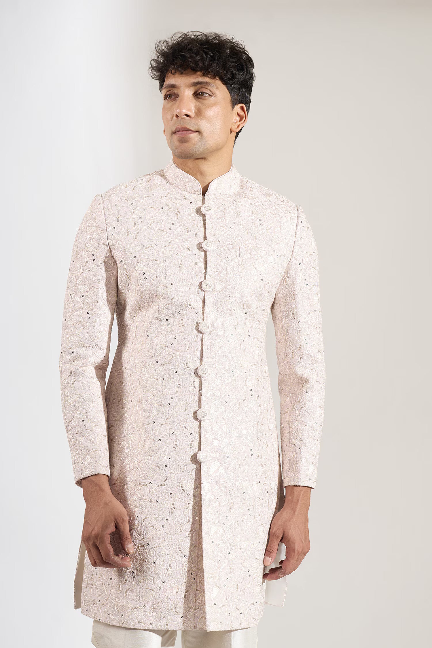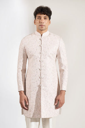 Blush Pink raw silk based achkan with all over resham and sequins embroidery paired with an off white dupion silk based pants.