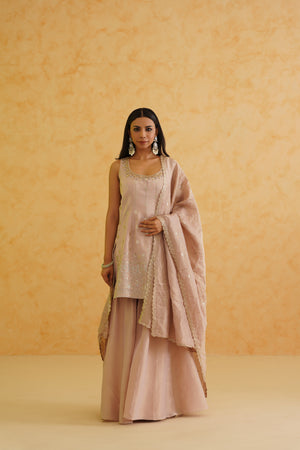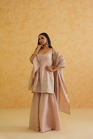 Blush Pink Georgette Tissue Garara, Kurti And Dupatta Set