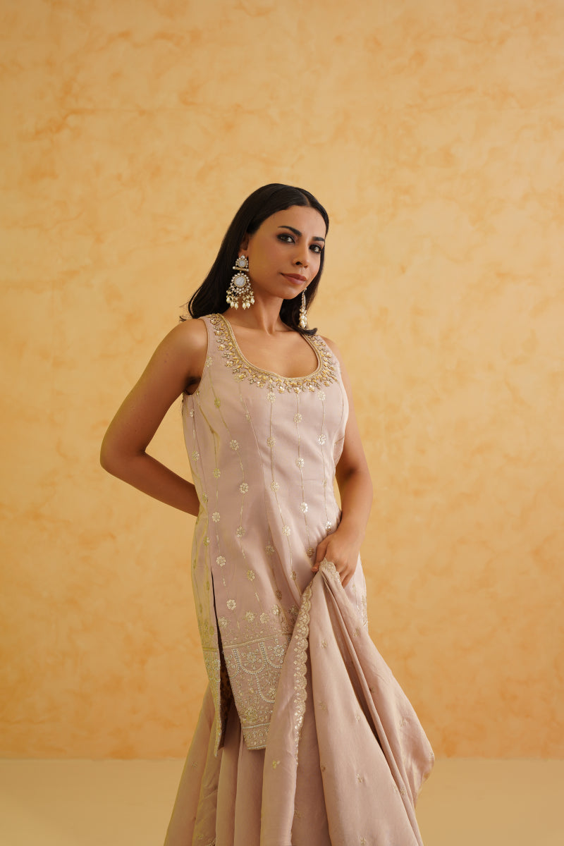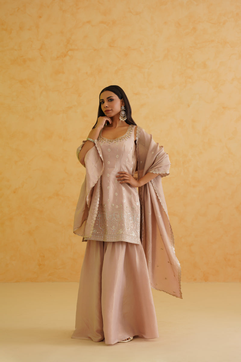 Deepika Chadha's stunning blush pink georgette tissue fabric Garara, beautifully adorned with intricate gold crystal, sequins and bead embroidered floral kurti. The blush pink color adds a touch of glamour and sophistication to your look, while its texture ensures you feel comfortable all day or night long. It is styled with a blush pink georgette tissue Dupatta to complete the look.