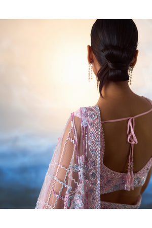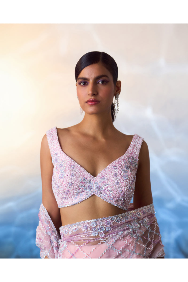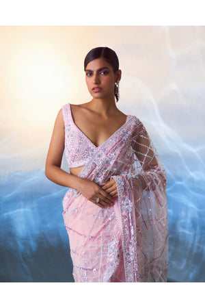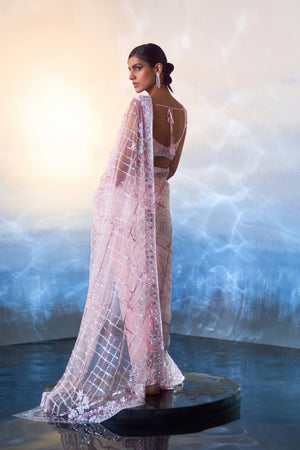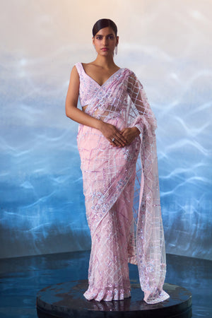 A blush pink net saree embroidered with multicolored sequins, crystals and bugle beads.