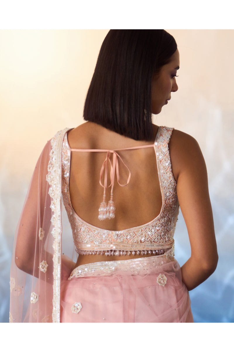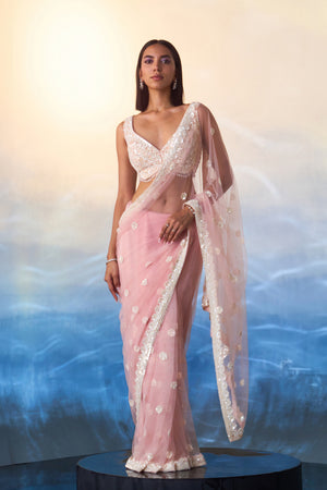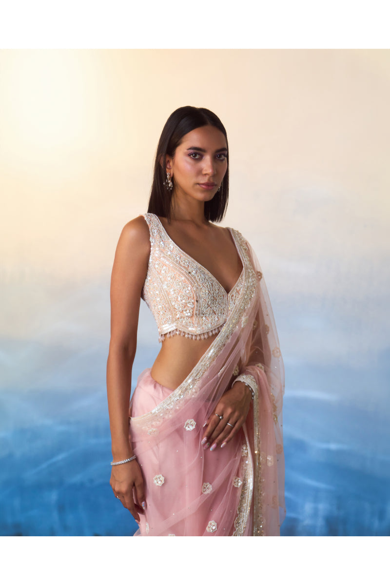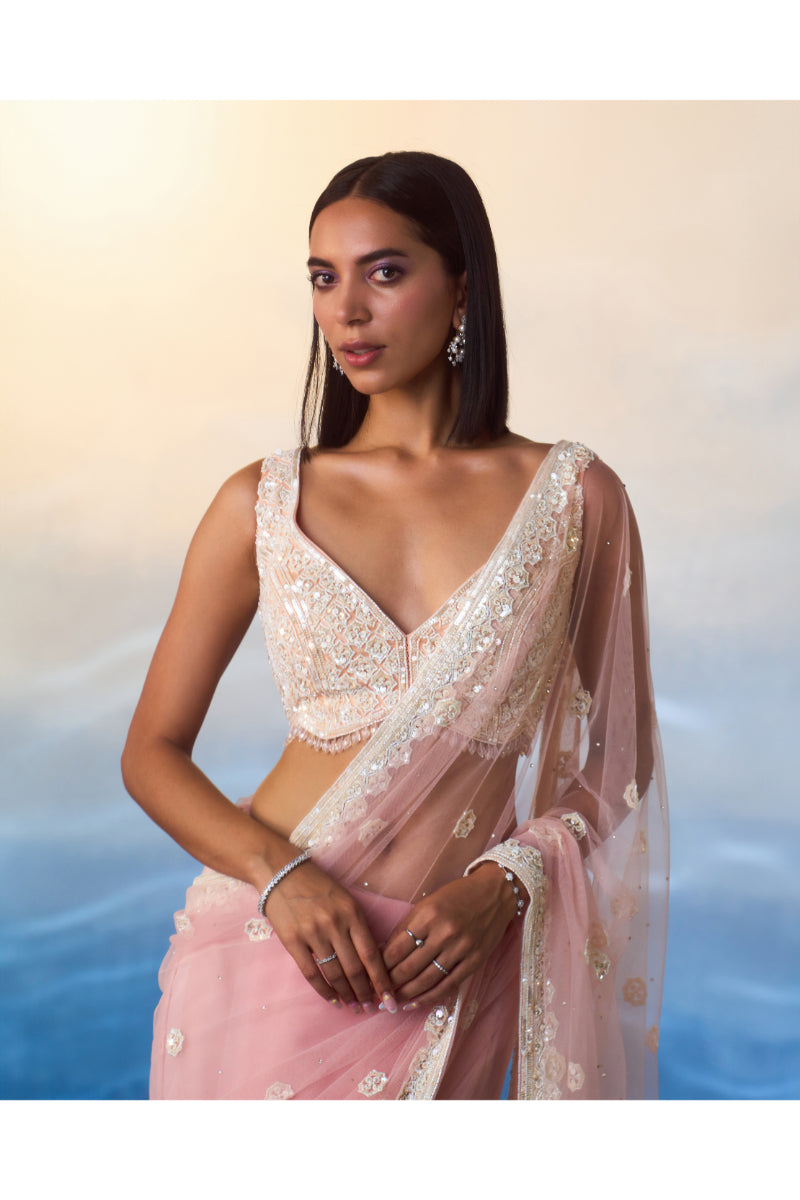 A blush pink net saree embroidered with white bugle beads, sequins and crystals.