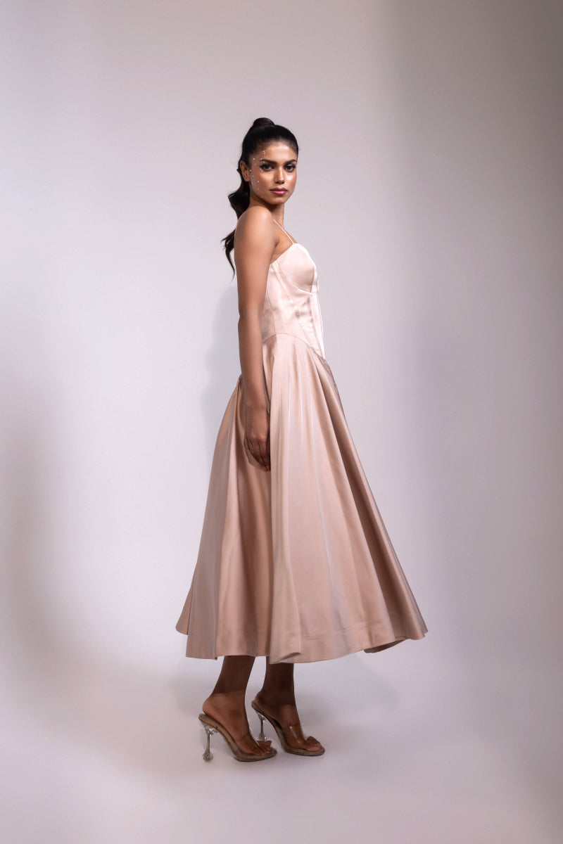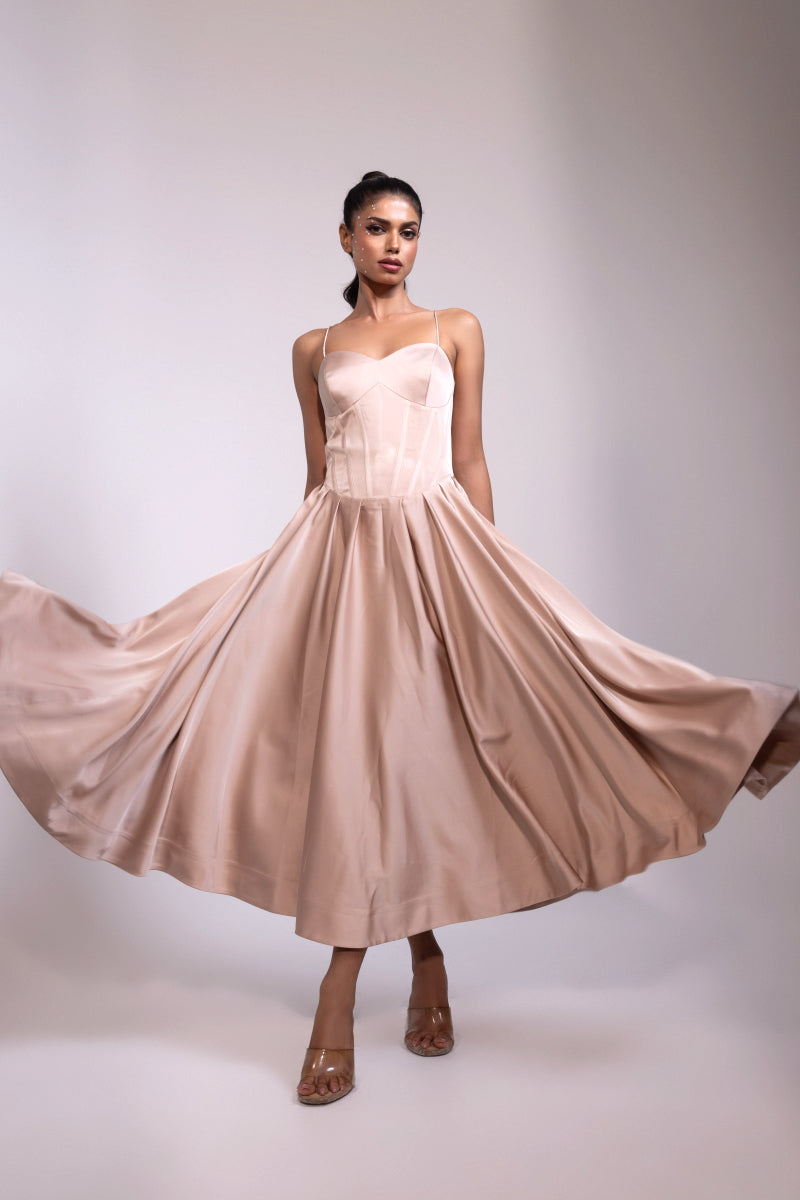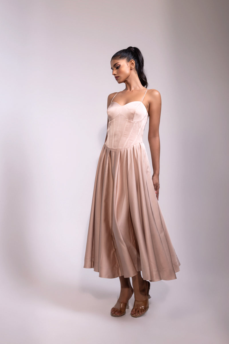 Blush pink satin midi dress with spaghetti straps, a fitted corset-style bodice, and a flowing A-line skirt.
