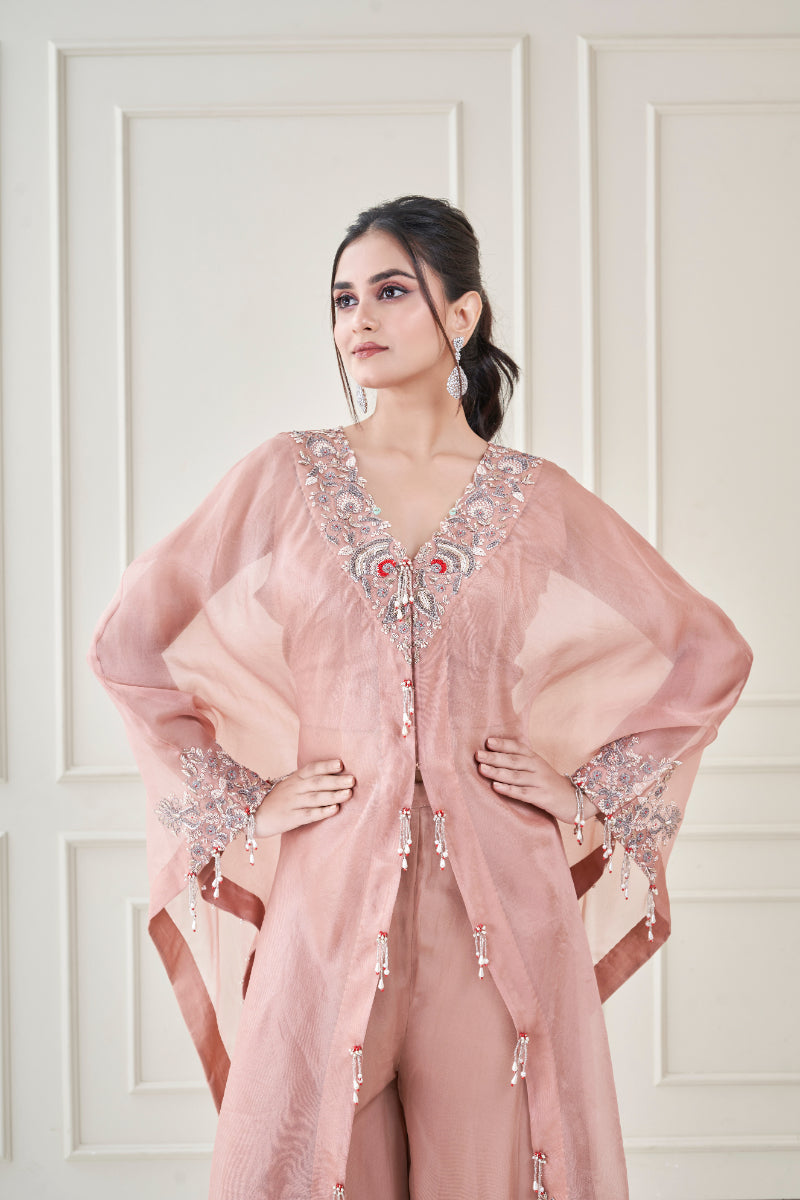 A Blush cape set with intricate thread and sequin embroidery across the neckline, cuffs, and hem. The pleated inner flare adds movement while the cape overlay brings effortless drama. Lightweight, impactful, and crafted for celebration nights — this set is where tradition flirts with high fashion.