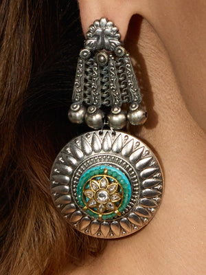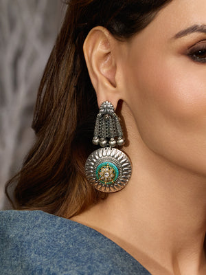Channels timeless charm with Bold Heritage Oxidised Earrings, featuring antique silver stones, intricate temple-style motifs, and a touch of green enamel.