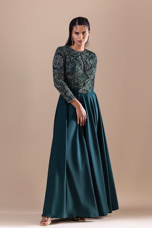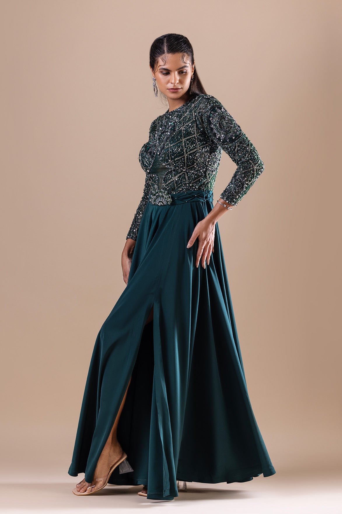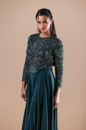 Bottle Green dress made of net with angela crape featuring crystal, cutdana, sequins, and Swarovski embroidery.