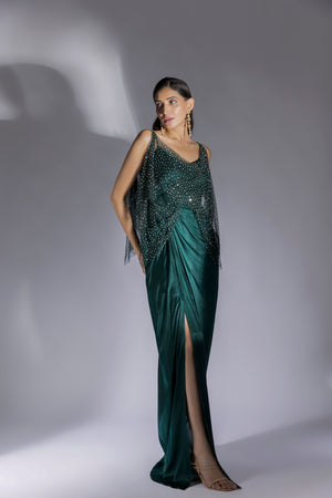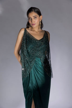 Featuring Bottle green embroidered drape dress in net. It contains one piece.