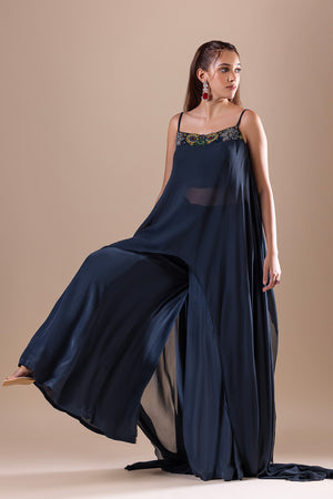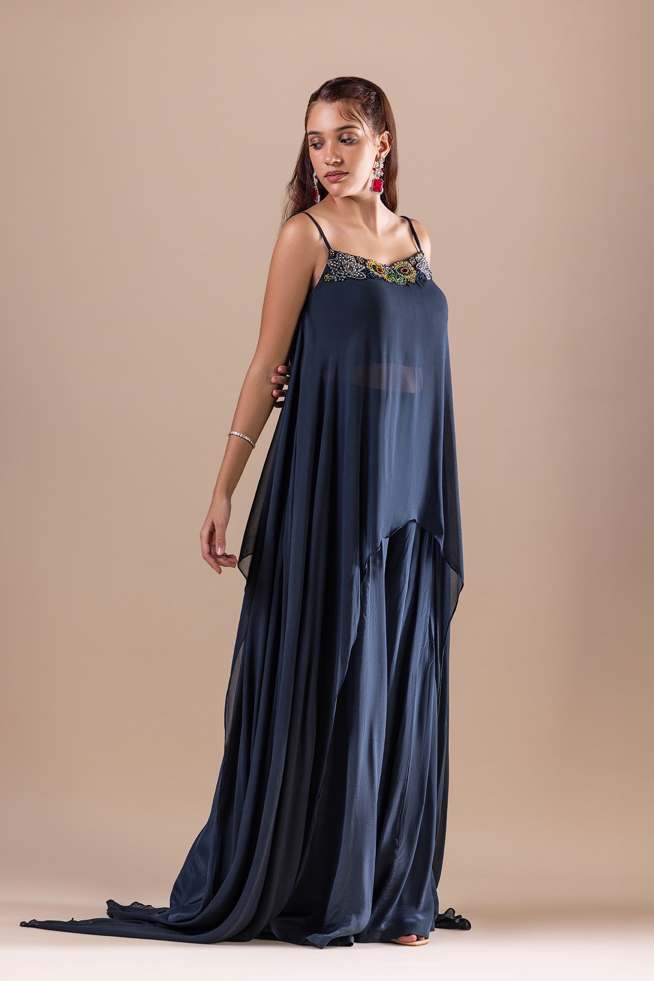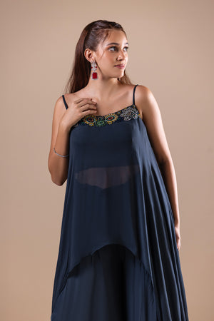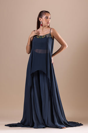 Bottle green long top in Georgette featuring crystal, cutdana, sequins, and Swarovski. Pairing with matching bustier and sharara