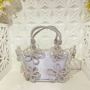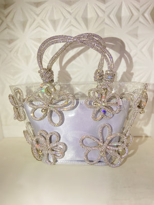 Mini Tote Bag White The Sliver Pouch Attach To It. Comes With The Floer Work On The Top Of The Plastic Bag.