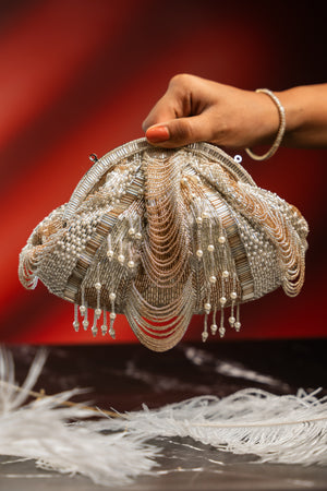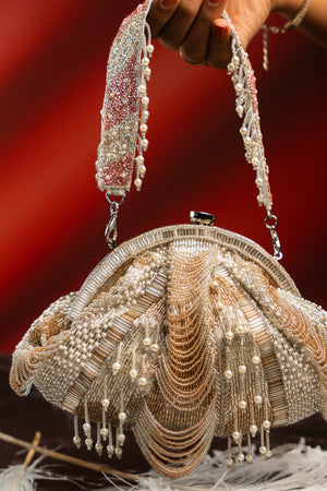 Add a hint of shimmer to your evening ensemble with this elegant Silver and Rose Gold Scallop Clutch. Featuring delicate scallop detailing in silver accented with a touch of rose gold, this piece is adorned with subtle beaded tassels and pearls for a graceful finish. The pearly beaded handle brings the perfect contrast to the design and is removable, allowing you to carry it as a traditional potli or a modern clutch. Finished with fine sequin and beadwork, it’s a versatile accessory designed to elevate your night-out look.