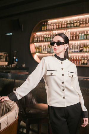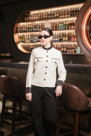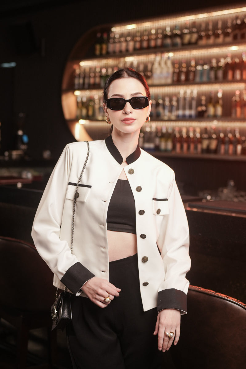 A sophisticated white luxury jacket that exudes elegance and style. This jacket is a timeless piece that adds a touch of sophistication to any outfit. The pristine white color gives it a classic and chic look, perfect for both formal events and casual outings. It's a versatile wardrobe staple that radiates luxury and refinement.