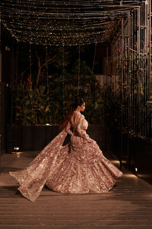 A luxurious lehenga set with an attached drape dupatta, creating a seamless and elegant silhouette. The lehenga skirt is grand and voluminous, adorned with intricate embroidery and delicate embellishments that add a regal touch. The blouse is designed with full sleeves and a high neckline, exuding sophistication while complementing the overall ensemble. The attached dupatta drapes effortlessly over one shoulder, enhancing the graceful flow of the outfit and offering a modern yet traditional appeal. The combination of rich detailing, structured draping, and soft hues makes this ensemble perfect for a bridal or festive occasion.