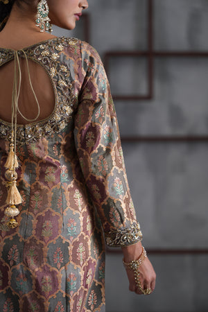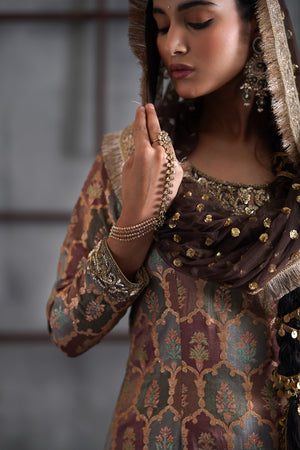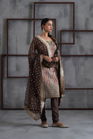 Deepika Chadha's stunning Brown brocade kurti beautifully adorned intricate sequins, cutdana, beads, dabka , stones and zari embroidery on neckline and sleeve bottom. It is paired with brown lycra churidar. The embroidered soft net dupatta with golden bootis and borders keeps you light and comfortable all day long and is perfect for wedding and festive season.