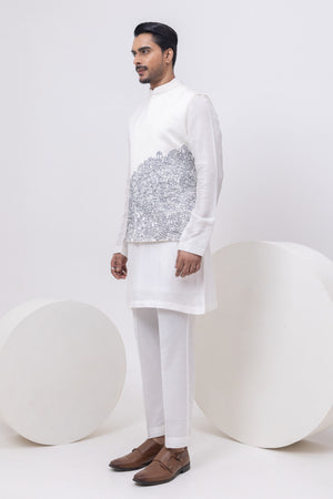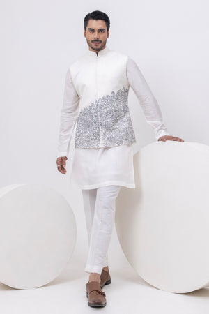 A statement Nehru jacket featuring intricate black embroidery of clustered architectural motifs, a skyline of stories etched in thread. Understated yet unforgettable, this piece blurs the line between structure and style.(Includes kurta and pants)