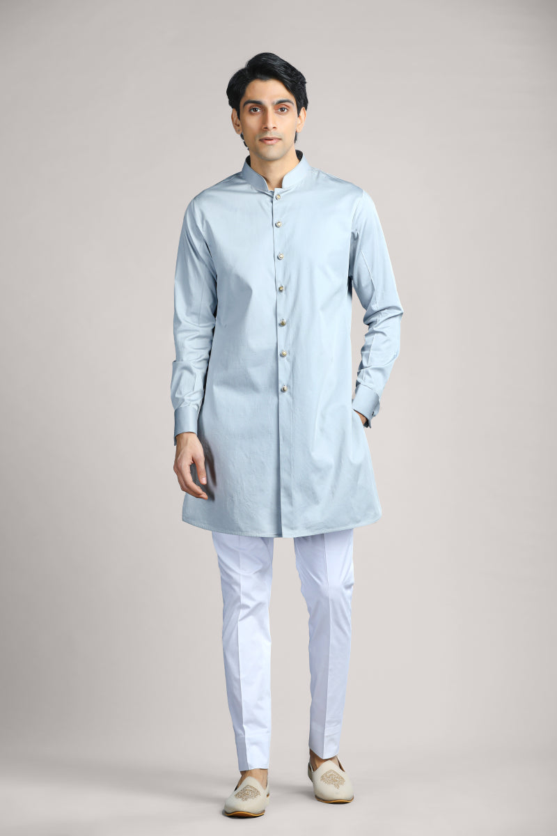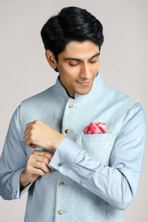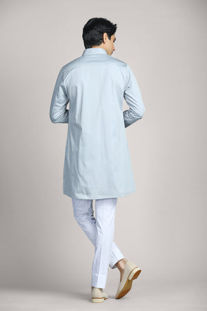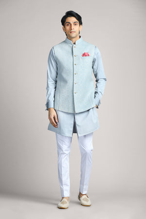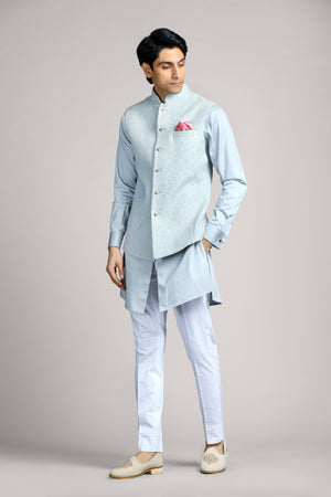 Bluish Grey Kurta & Bundi Set, crafted from soft cotton fabric, this kurta exudes comfort and elegance. Paired with a Bundi featuring a detailed and intricate pattern, this set adds texture and sophistication, making it a timeless choice. For an elevated look, team it up with breeches or straight pyjamas to enhance your style.