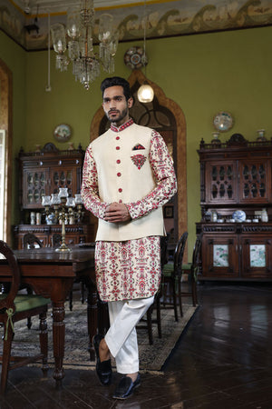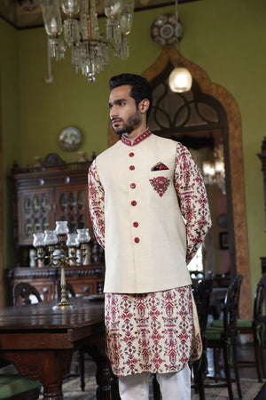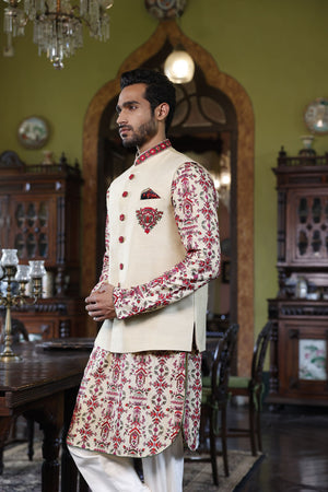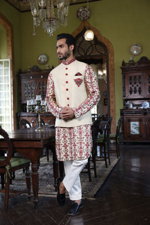 This is a bundi, kurta and pant set with the bundi sherwani having emblem and collar embroidery, and the kurta having geometric embroidery in green, red and pink resham. The pants are straight made from a cotton blend fabric.